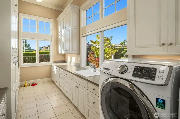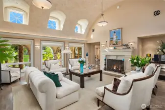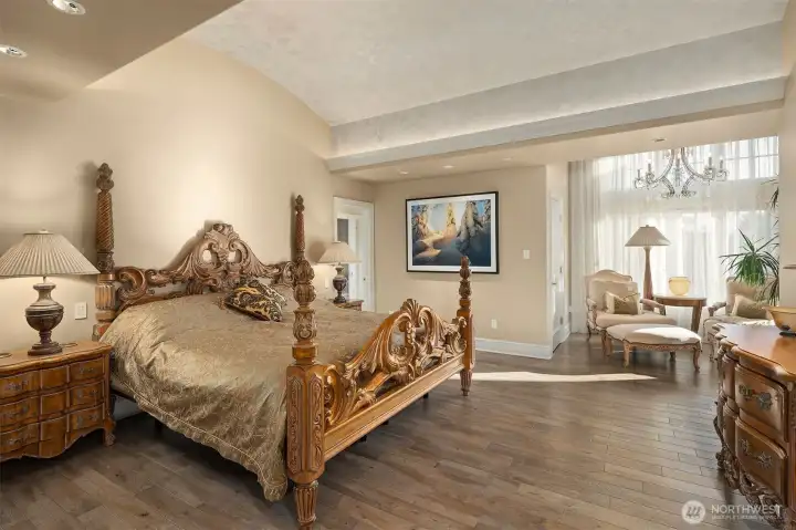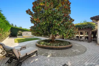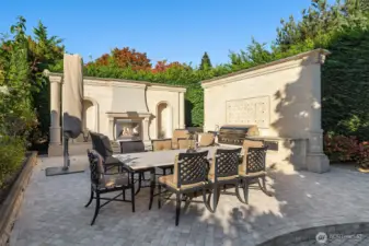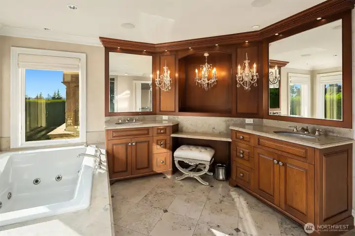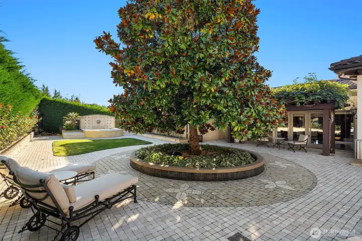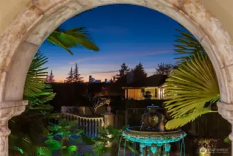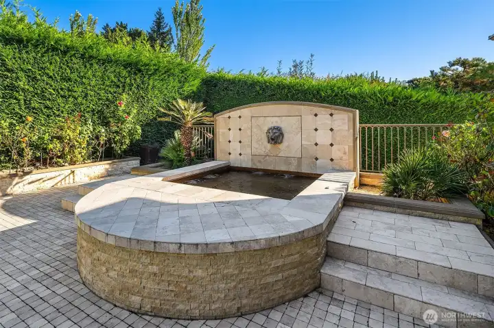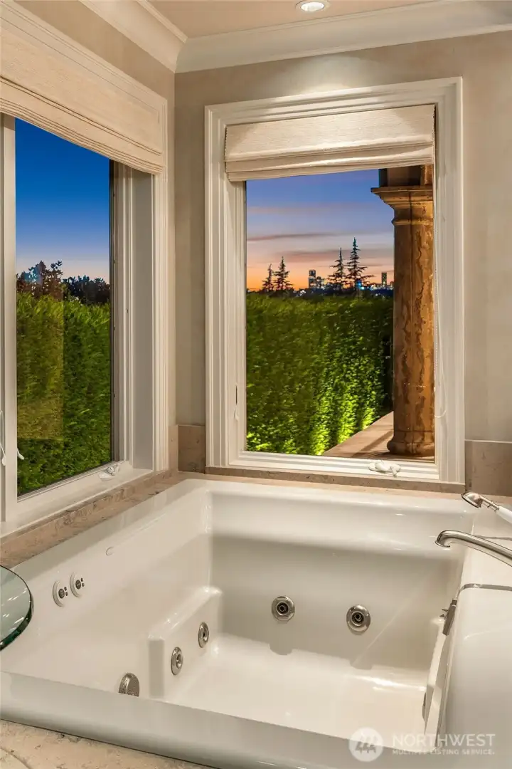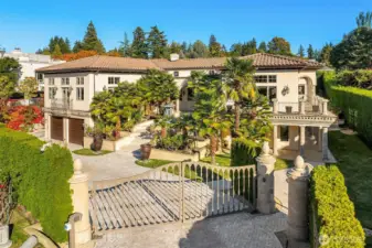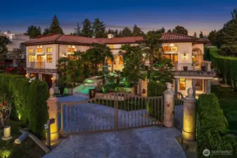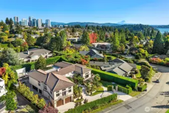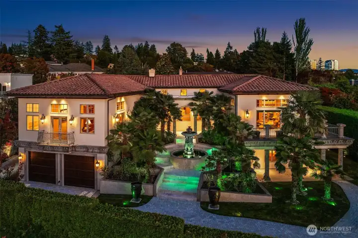 One of a kind Mediterranean style home minutes from DT Bellevue features Seattle skyline views. Fully fenced, surrounded by hedge & secured with camera & motion security. Professionally landscaped private gardens, w/palm trees, original bronze entry fountain, limestone tile driveway. Tile roof. Grand outdoor stone terrace w/fireplace & BBQ. Backyard stone hot tub. Beautiful warm interior w/radiant heating, vaulted ceiling, spacious kitchen w/city view, ultimate recreation/media level with opulent finishes & mini bar. Main floor master and guest suites with soaring ceiling heights. Solid integrity with classic artistic flair is captured within every fine detail. 3 + 2 heated garages.
