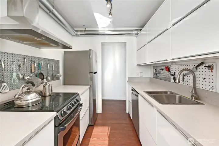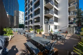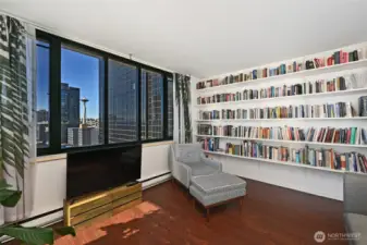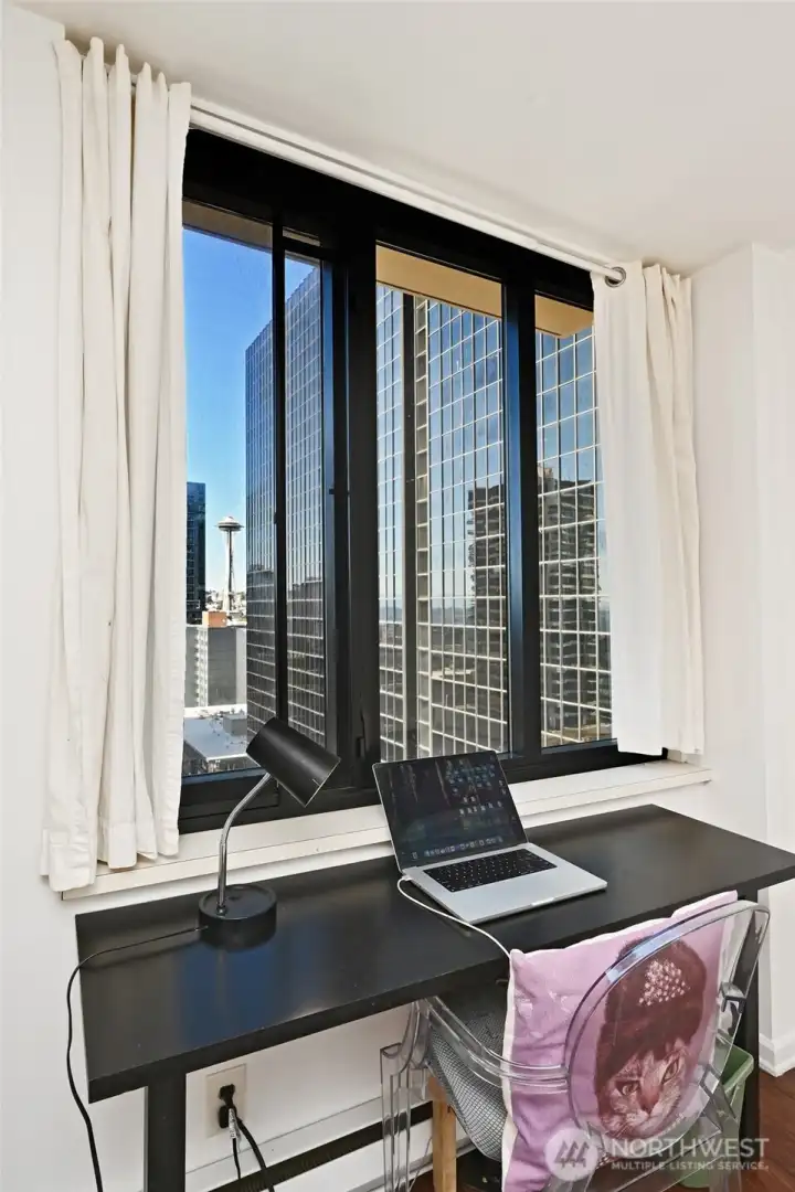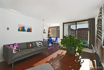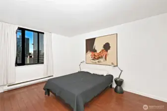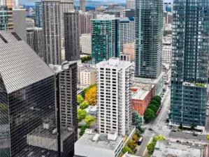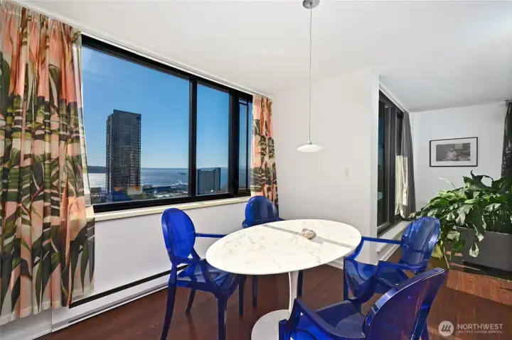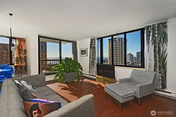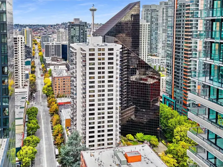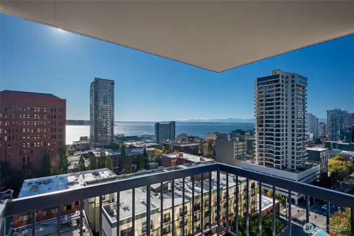 Fully furnished 2 bedroom, 1.75 bath corner unit on the 15th floor designed for comfort, function & convenience. Enjoy stunning NW views of the Space Needle, Elliott Bay, Puget Sound & Olympic Mountains from the expansive windows, sliding glass door & covered balcony. Updated kitchen offers stainless steel appliances & ample storage. Primary suite w/ ensuite bath & walk-in closet. Building amenities include outdoor pool, fitness center, sauna, club house & secure lobby w/ mail room & Amazon lockers. Deeded parking in secure garage + storage. Ideal in-city home or pied-a-terre. HOA dues include all utilities & earthquake insurance. Steps to Pike Place Market, public transit, dining, shopping & the waterfront. Walk score=99/Transit score=100!