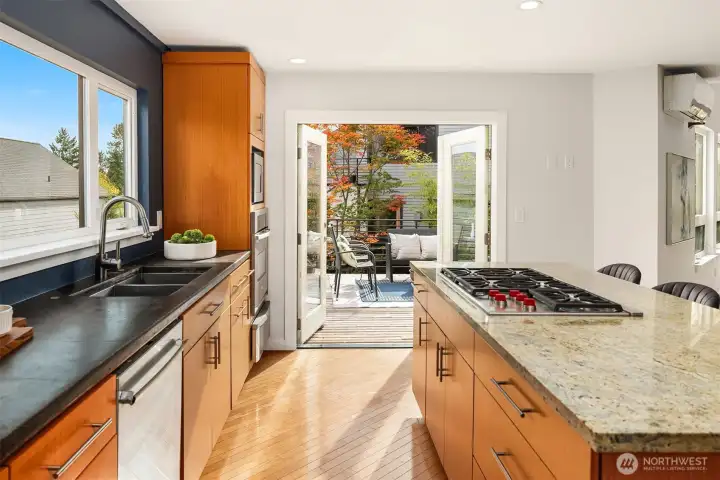 Cool, contemporary, and full of light. Vaulted ceilings, and lots of windows. This home offers open-concept living at its best. The stylish kitchen features granite and concrete counters, stainless appliances, a wet bar, and a walk-in pantry/utility room. Kitchen opens to a spacious deck made for entertaining. Upstairs, the primary suite feels like a retreat with its soaking tub, rain shower, and walk-in closet. The rooftop deck takes it up a notch with its own wet bar and gas BBQ hookup — perfect for sunset hangouts. Downstairs offers flexible space with 3 bedrooms, full bath, and a cozy rec room that opens to a large patio, private yard and newer salt water hot tub. Fresh paint, new carpet, beautifully staged — this home is a total gem.