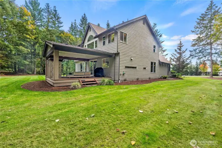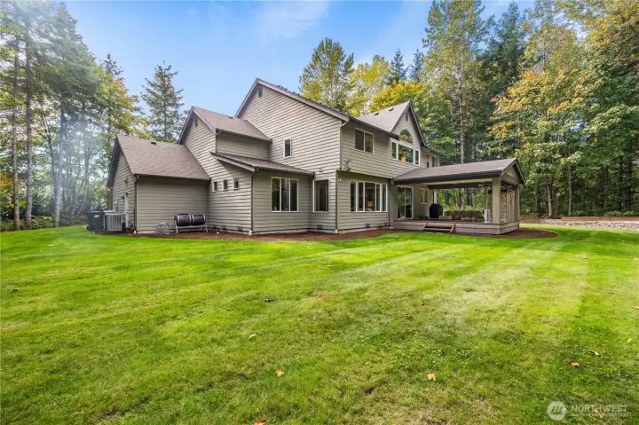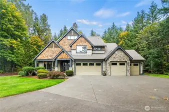 Exceptional Curtis Lang home in private, gated Meadows at Lake Sawyer. 5-bed, 3-bath masterpiece stands on 2+ flat, usable acres. Inside, find hand-scraped hardwood floors, rustic beams, & exotic solid wood doors. Main floor includes formal dining/living areas, butler's pantry, huge great room, den/office, & guest suite w/bath for multigeneration living. Chefs kitchen features huge island & slab granite counters. Upstairs holds an expansive bonus room or bed & spa-like primary suite w/walk-in closet. Outside, a 20'x20' covered patio w/stone fireplace is perfect for entertaining. Amenities include 4-car garage, RV/boat parking, central A/C, wired security system, & room for shop. Minutes to boat launch, parks, & bike trail systems.