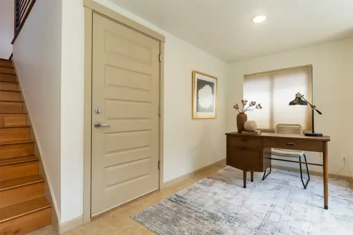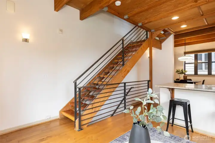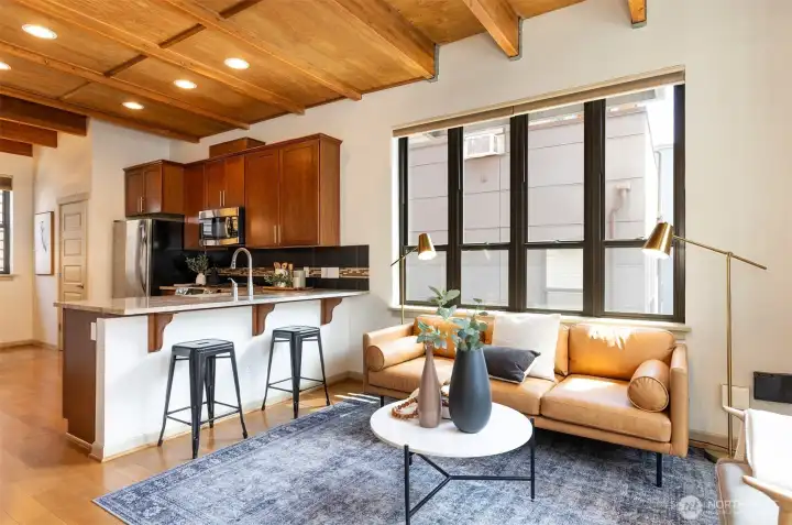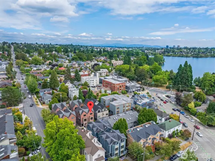 Live the active lifestyle in this stylish Green Lake townhome blending industrial charm & modern design—just steps from the lake and trails. After crossing the charming courtyard, enter to a flexible office/den adjacent to the 1-car garage. The next level brings light-filled great room with soaring ceilings, wood accents, hardwood floors, a sleek kitchen with granite counters, stainless appliances & separate dining space and powder room. An open-tread staircase with stainless steel railings leads to the upper level with, cork flooring, two bedrooms w/ vaulted ceilings and full bath, creating a peaceful retreat above it all. Step outside to run, bike, swim, or play at Green Lake, with cafes, tennis courts, and RapidRide all moments away.