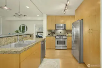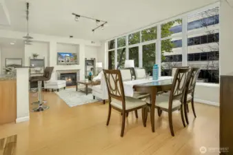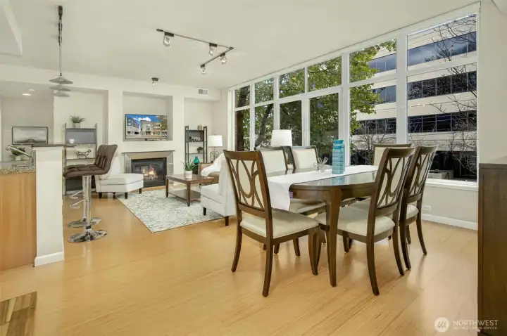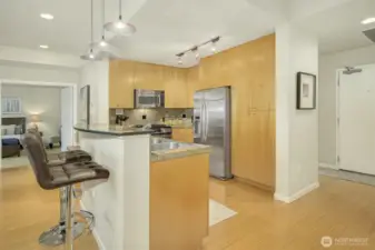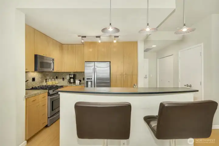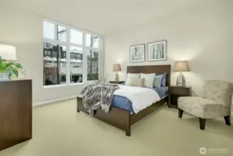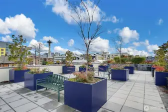 What a rare find! Comfort, style, and incredible value rolled into one! Whether you're investing or looking for a place to call home, this stair-free condo wraps you in modern ease. Light-filled with soaring ceilings, it features two oversized bedroom suites with walk-in closets and a full-size laundry room. The open layout flows from kitchen to dining to living, with a bar perfect for casual meals. Pet-friendly, secure building with garage parking. No rent cap and all utilities (except power) included—smart investment potential! Steps to theaters, cafés, grocery stores, and the Climate Pledge Arena. Don’t miss the rooftop deck with iconic Space Needle views!