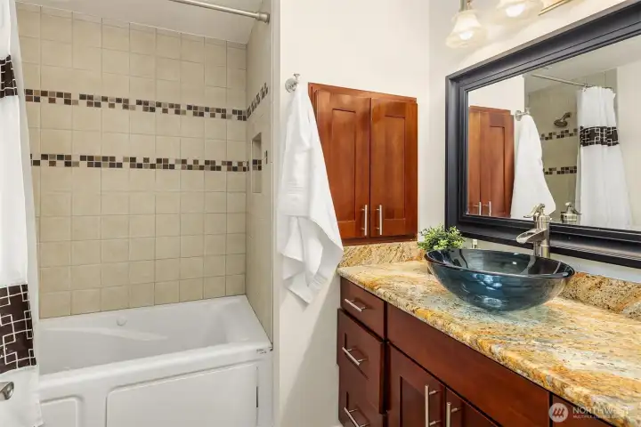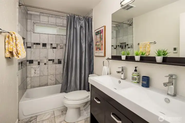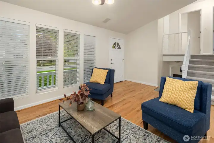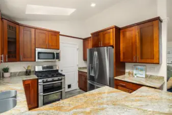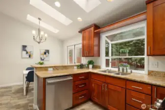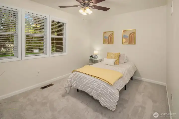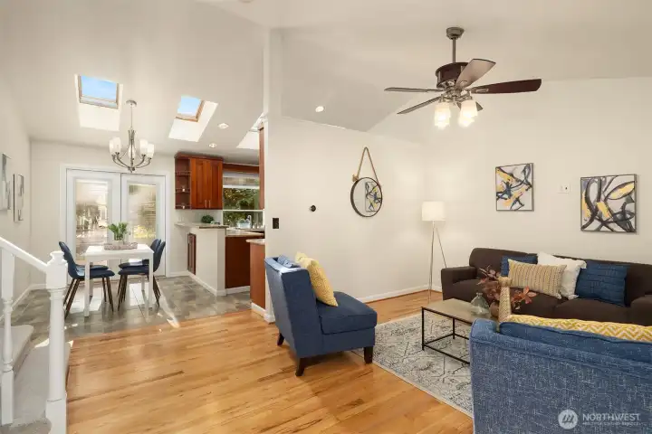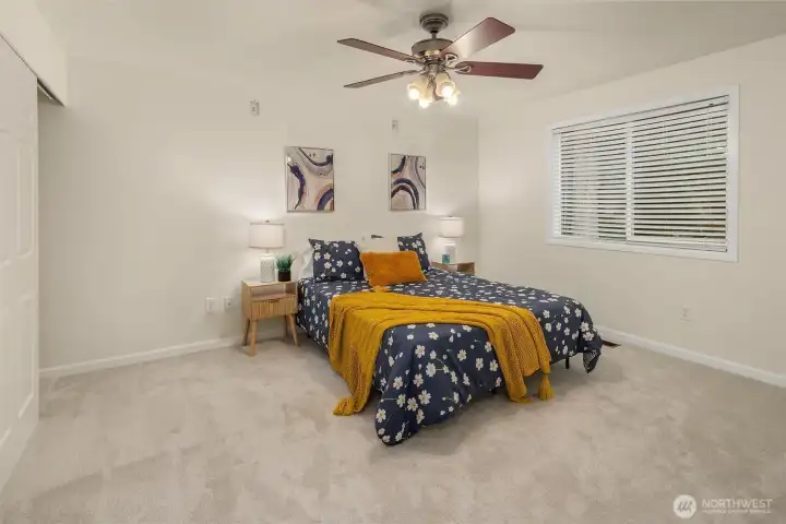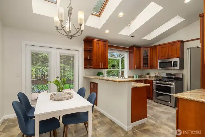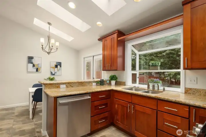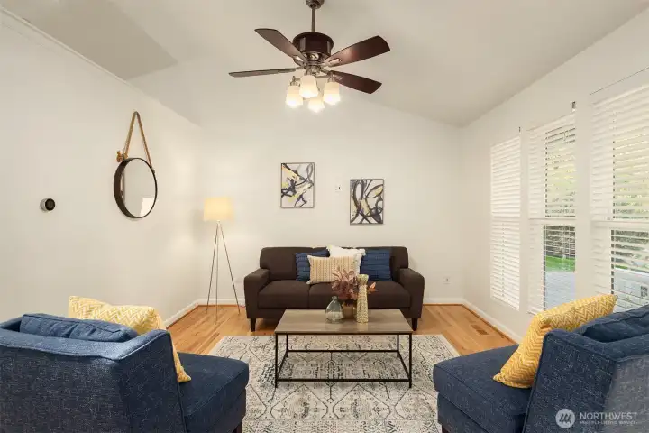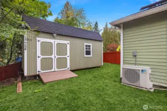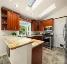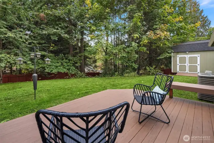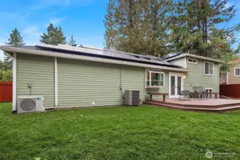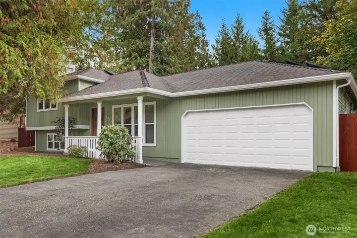 Beautifully updated 3-bedroom, 2-bath home on a quiet street with a large, level ¼-acre lot. A spacious front yard and inviting porch lead into a bright, open living area featuring vaulted ceilings & newly refinished hardwoods. The remodeled kitchen offers stainless steel appliances & a sunlit dining area with four skylights. Enjoy modernized baths & custom closets in the primary suite. The fenced backyard boasts a low-maintenance Trex deck—perfect for entertaining. Save on energy with 26 solar panels with microinverters designed for efficient performance year-round. Includes a 200 sq. ft. shop or studio (not in sq. ft.), new paint and carpet, a heat pump for cooling & award-winning Lake WA schools. No HOA. Pre-inspected and move-in ready!