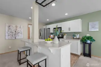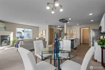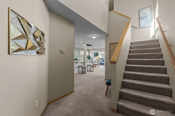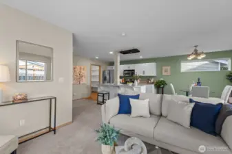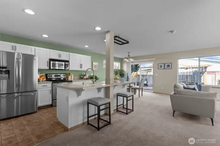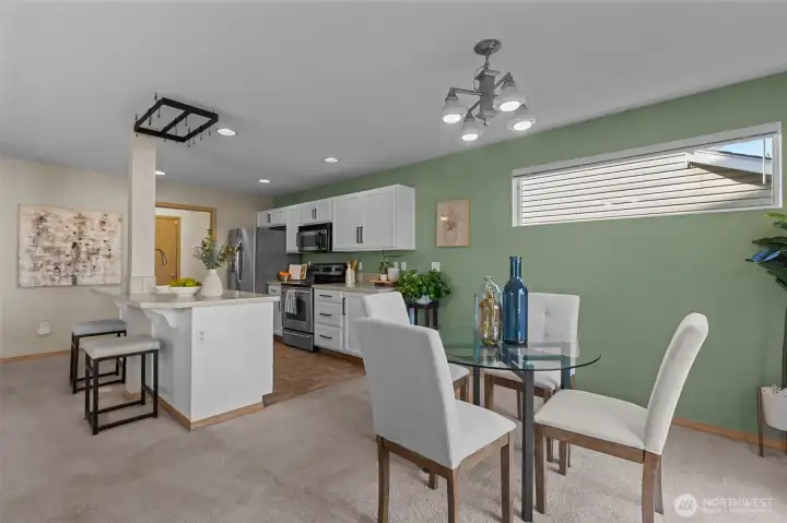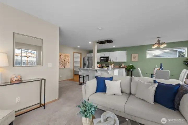 Rare corner residence in Evergreen Ridge, this Townhouse lives like a single-family home with only a small storage-area wall being shared. The main level’s open plan centers on a stainless-equipped kitchen with island and a cozy gas fireplace. Upstairs: 3 bedrooms, 2.5 baths, and a custom built-in desk that makes a perfect home office or study zone. Thoughtful upgrades include a whole-house fan, large kitchen pantry. Outside, enjoy a fully fenced backyard with patio, deck, and dog run. 2-car garage plus driveway parking for two. Across from the association playground and sport court. At ~1,716 sq ft, opportunities at this price point with this feature set are scarce in Graham.