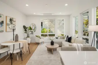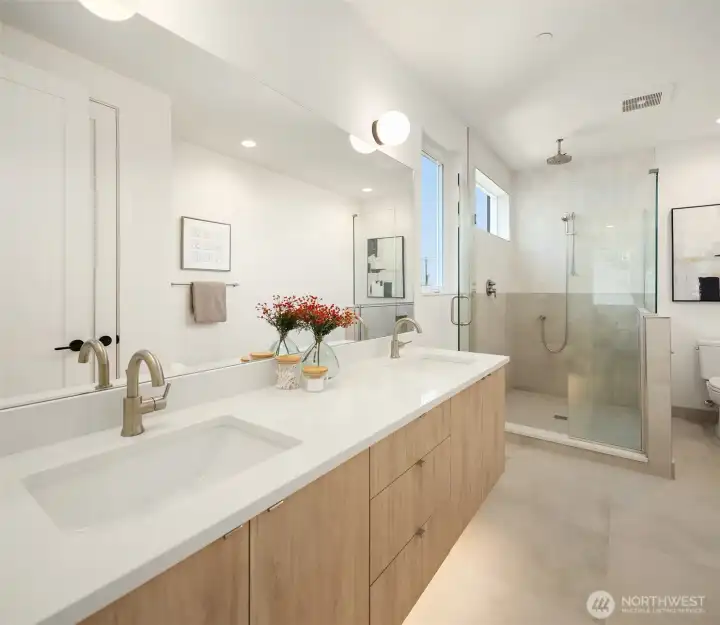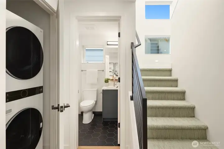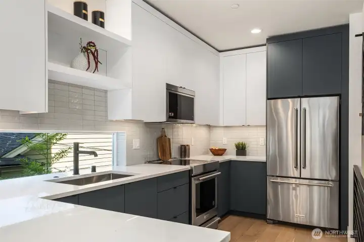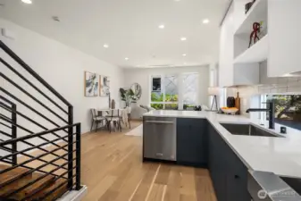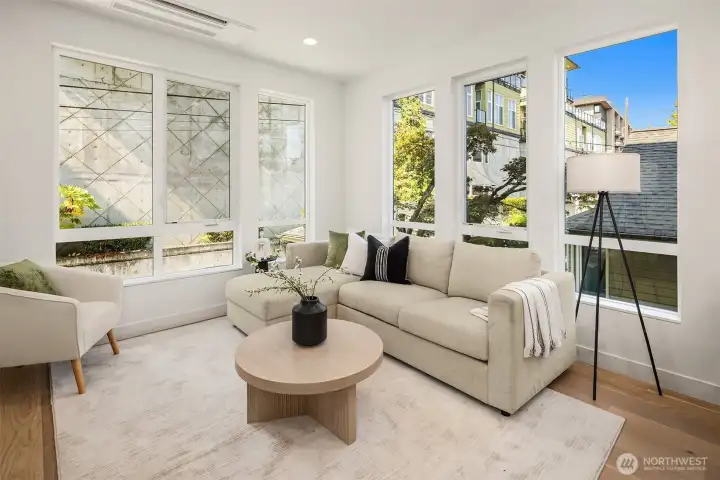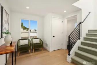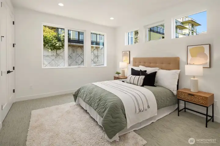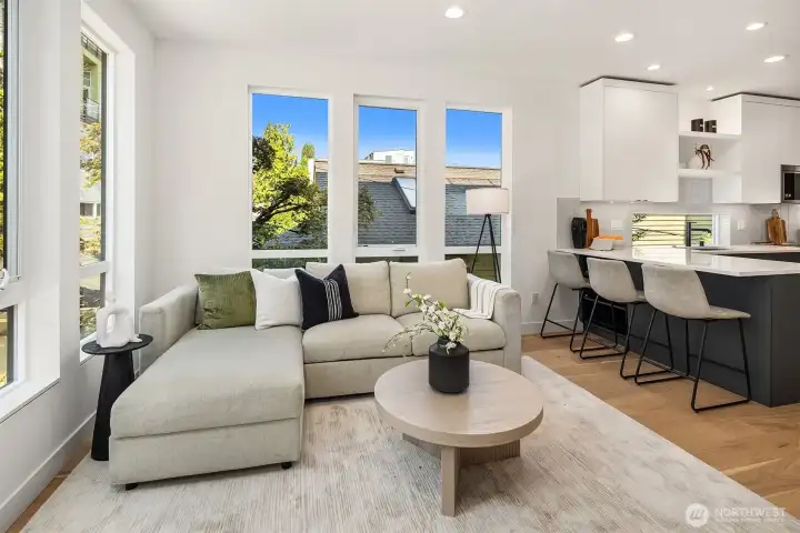 Live where Seattle comes alive—just minutes from SLU, lakeside trails, and Queen Anne cafés. From your private rooftop deck, soak up Lake Union views, sparkling city lights and host summer nights under the stars. Inside, three bright bedrooms and an open, social floor plan make everyday living feel connected. The sleek KitchenAid kitchen is ready for dinner parties, while the floating open-tread staircase doubles as a design statement. Need space to hustle or sweat? The bonus flex room is perfect for your WFH setup or home gym. Zoned heating + A/C keep it cool in summer and cozy in winter. Covered EV-ready parking, washer + dryer included, engineered hardwoods, and plenty of storage round out the perks. Urban living, elevated.