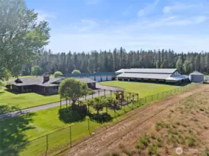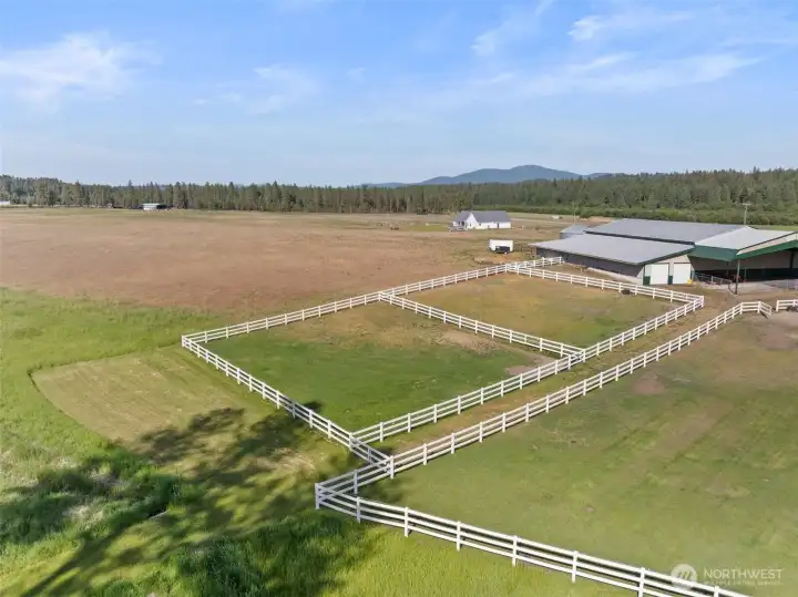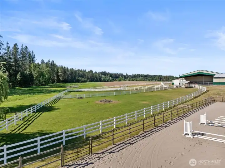 Crescent Bend Farm is a meticulously cared for equestrian estate on 20.03 acres in Chattaroy featuring a 4,200+ sq ft brick rancher with thoughtfully planned horse facilities for the professional or hobbyist alike. The 5 bed, 3 bath home offers a primary ensuite, spacious kitchen, office, mudroom, finished basement, multiple living spaces & covered patio. The 60'x100' indoor arena features overhead lighting & mason sand/rubber footing as well as 5 stalls + foaling stall with power, drive-through hay/equipment storage, & heated tack & feed rooms. The 100’x200’ outdoor arena, round pen and 4 fenced paddocks complete the setup. The gated/paved driveway & oversized 6-bay shop with EV hookup & backup diesel generator add to the appeal.