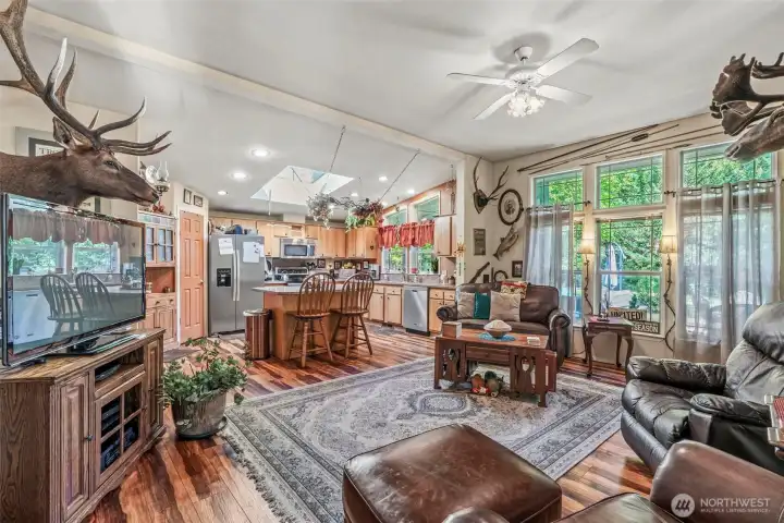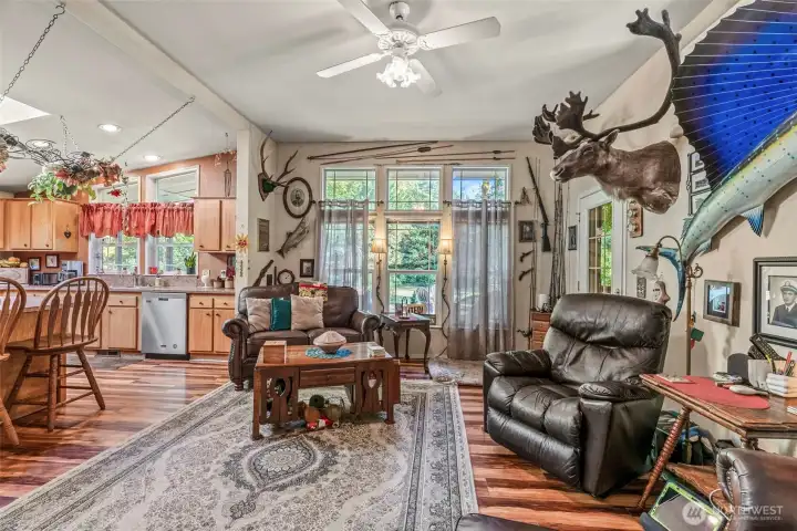 Country living in a peaceful, river view setting! Home is 4 bedroom, 2 bath (plus unfinished bathroom off kitchen). Kitchen opens up to great room with vaulted ceilings. Formal dining room and formal living room. Covered deck overlooking the backyard and a water fall feature. Property sits on 1.97 acres. Partially fenced area off of kitchen. Orchard with pears,apples and plums! Carports and shop provide plenty of storage! Shop has a walk in cooler and loft. So much to see don't miss out!