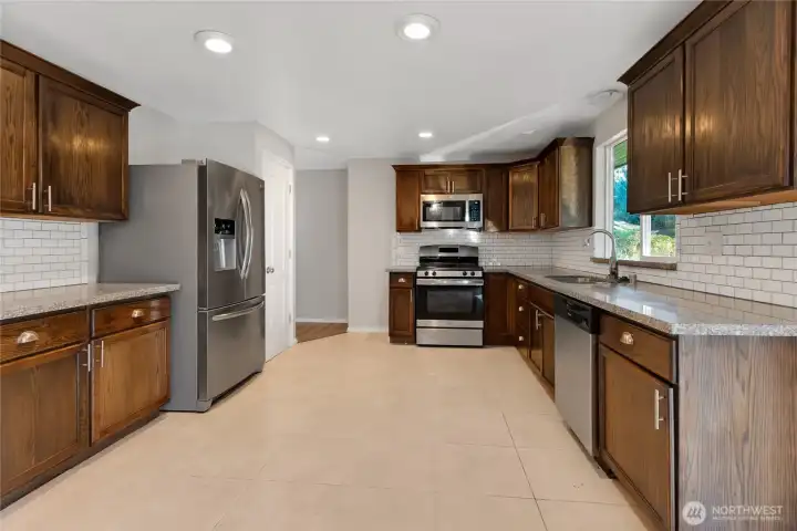 Lives Like a Rambler! Primary Bedroom On Main Floor with Attached Bathroom And Shower! Total of 3 bedrooms on main floor and 1 bedroom upstairs plus Bonus room (could be 5th Bedroom). 2,354 Sq Ft Total. 4 Bedroom 2 Baths! Wood Burning Fireplace w/ Electric Insert. Stainless Appliances and Gas Stove. Granite Counters. Newer Gas Furnace. Updated and mostly New Flooring. Huge Laundry Room. All situated on Big 13,000 Sq Ft Lot. Park Like Setting with Mature Landscaping, Fruit Trees and Fully Fenced. 2 Car Attached Garage. Big Driveway for Plenty of Parking. Large, Covered Patio out back for Entertaining and Firepit! Established Neighborhood. Close to Shopping and Restaurants.