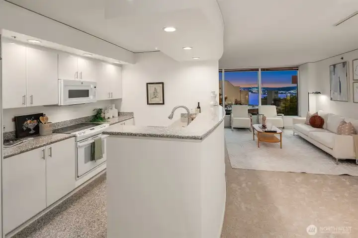 Best value available in Downtown Seattle! Spacious 1BR+DEN, which could double as a 2nd BR w/ its own bath. Steps to Pike Place & the revamped waterfront. This SW-facing home is drenched in natural light through oversized windows framing tranquil views of the garden terrace & protected views of Elliott Bay, visible from both main room & bedroom. Features incl. Central A/C, newly refinished patio, Sub-Zero fridge, granite kitchen counters/floors, fresh paint/carpet, limestone entry. Versatile den w/pocket doors doubles as guest room/flex space. Primary BR offers full en-suite bath + separate 3/4 bath for guests. Amenities: 24/7concierge, indoor pool/spa, gym, event room, view terrace. Garage parking. No rental cap & well-managed building!