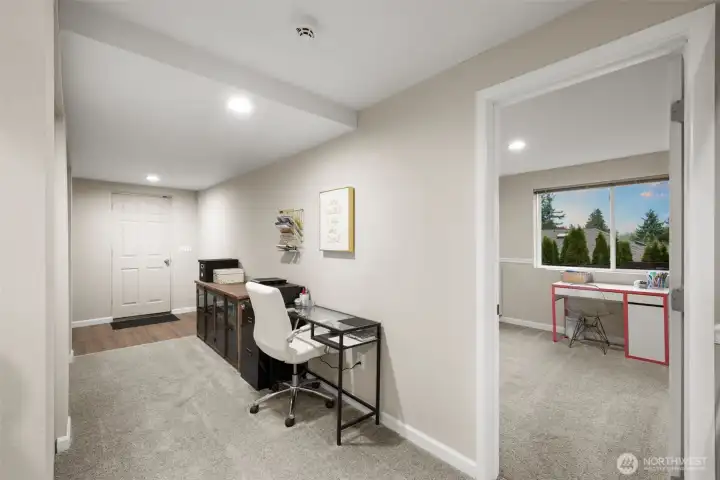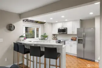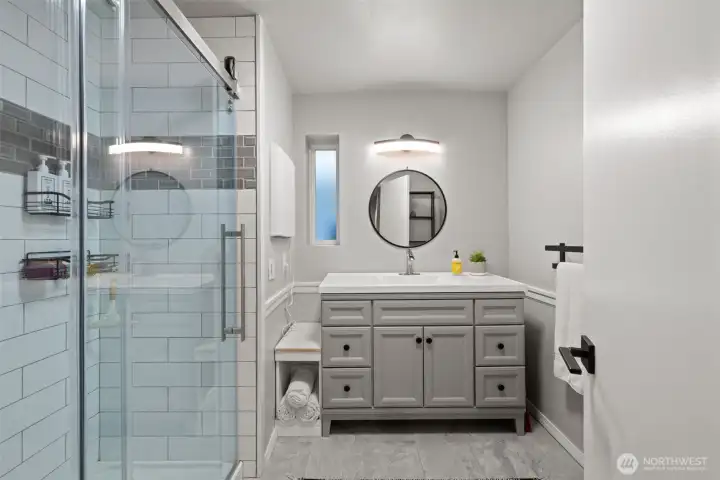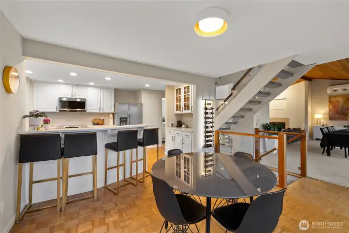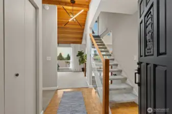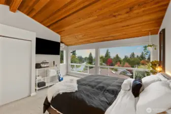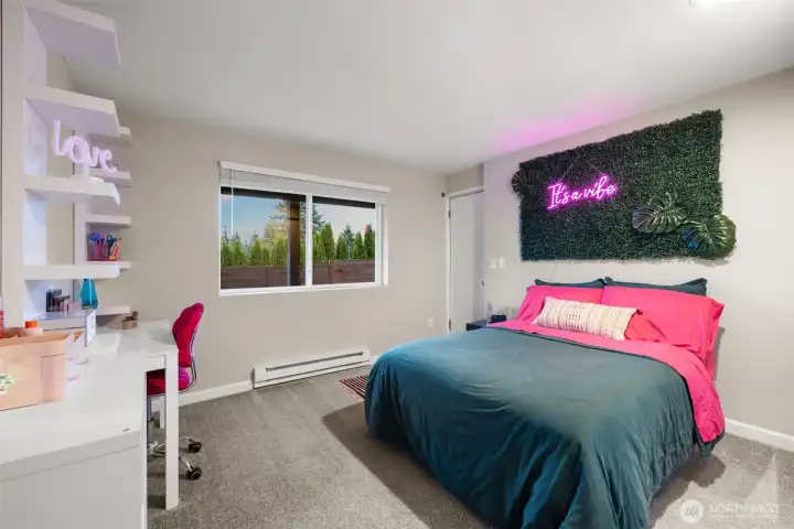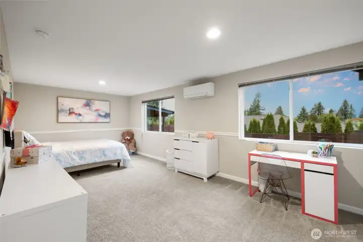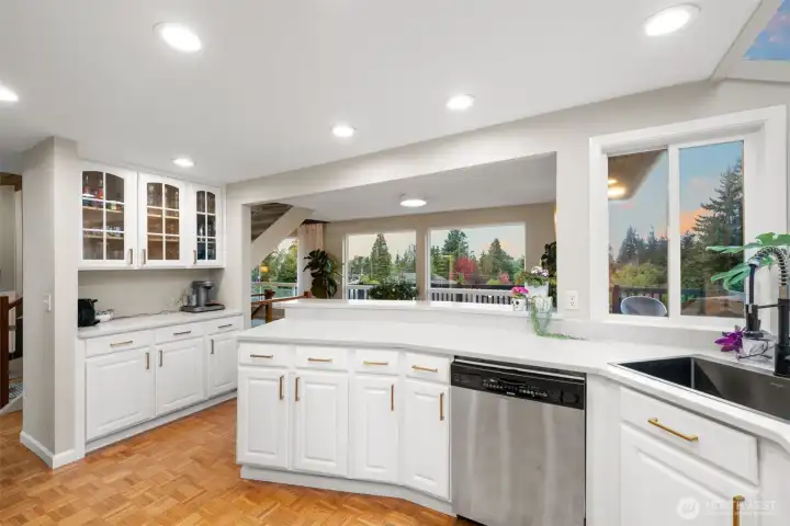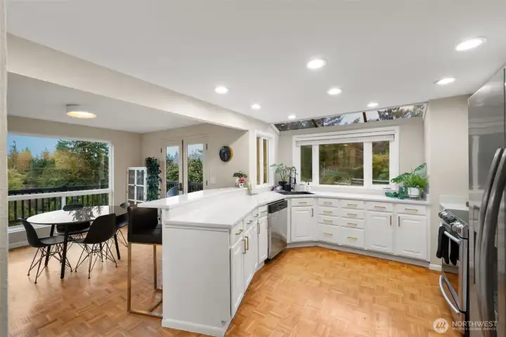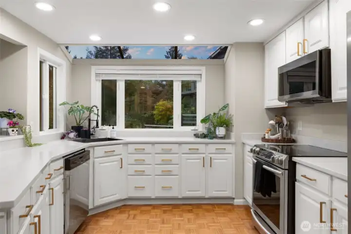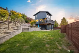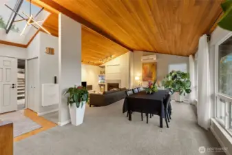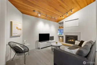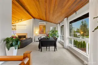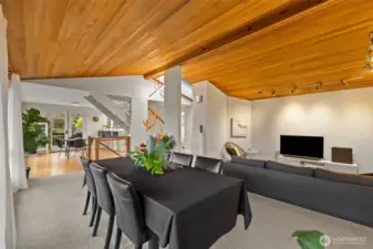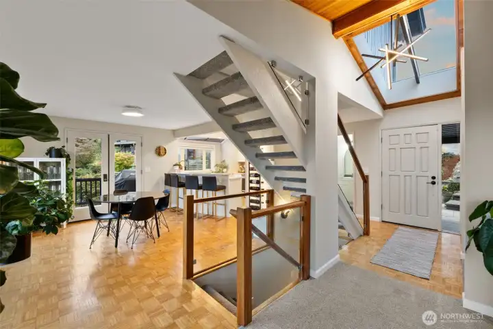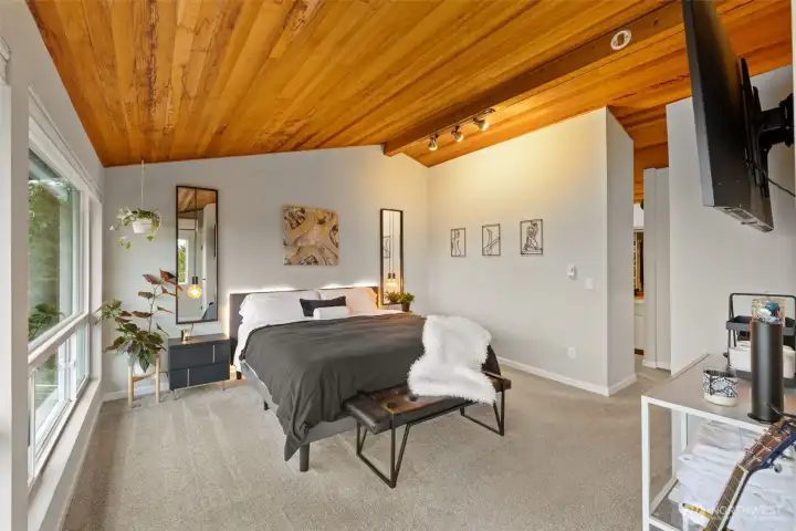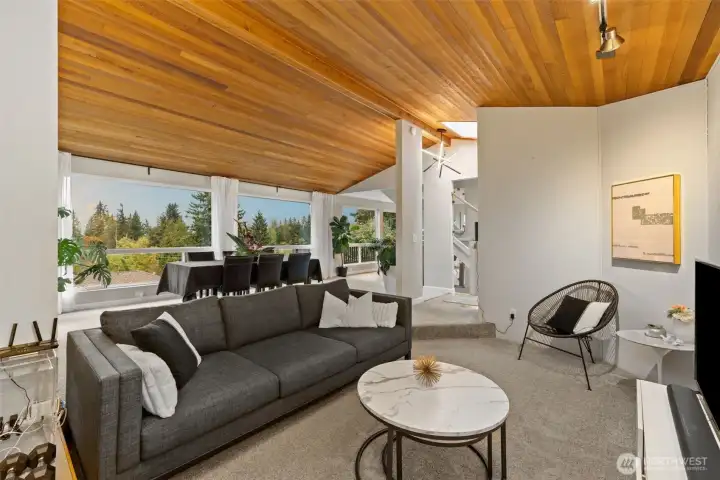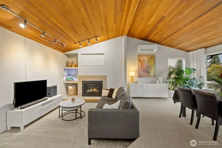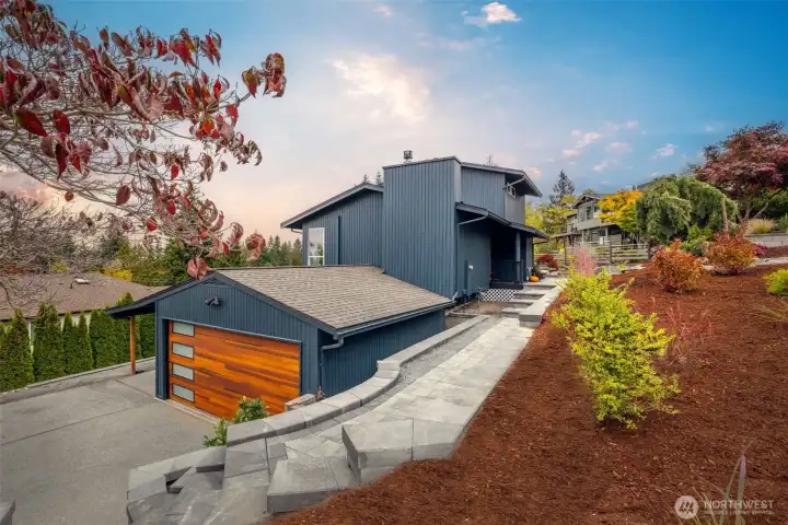 Awash with natural light and framed by oversized windows, this freshly painted Northwest Contemporary home captures peek-a-boo Sound views and a kaleidoscope of autumn color. The atrium-like kitchen glows, inviting morning coffee amid the trees. Cozy up by the gas fireplace under vaulted cedar ceilings, the perfect place to entertain guests or enjoy a quiet moment. Retreat upstairs to a private primary suite perched above it all. Outside, custom lit hardscaping and lush yard spaces unfold for gatherings under open skies. With modern comforts—tankless hot water, HP mini-split climate control—this home marries warmth, wit, and wonder in one inspired sanctuary. All in the desirable Boulevard Bluffs neighborhood.