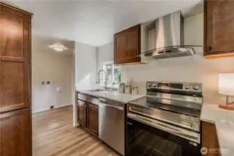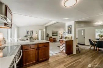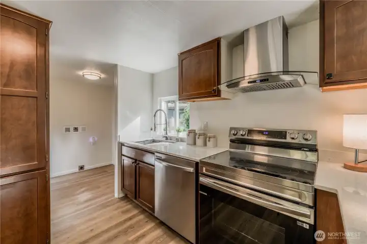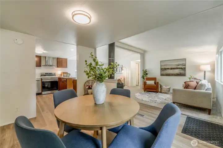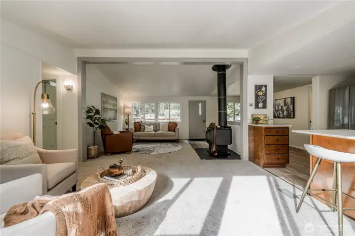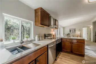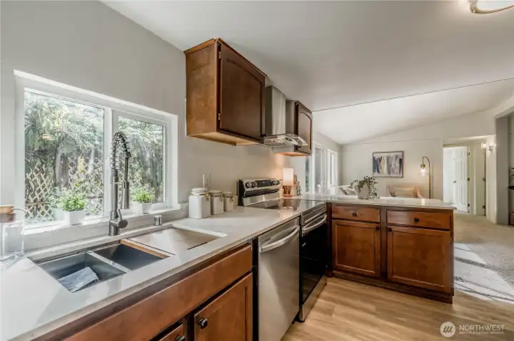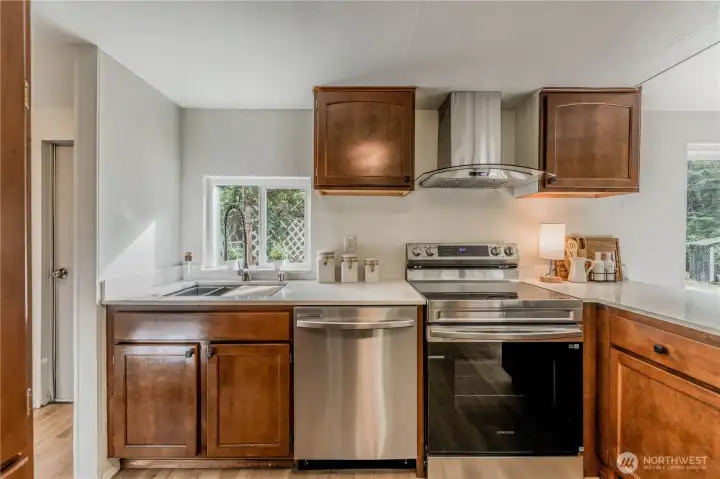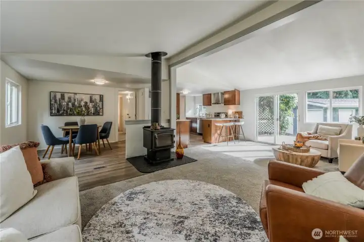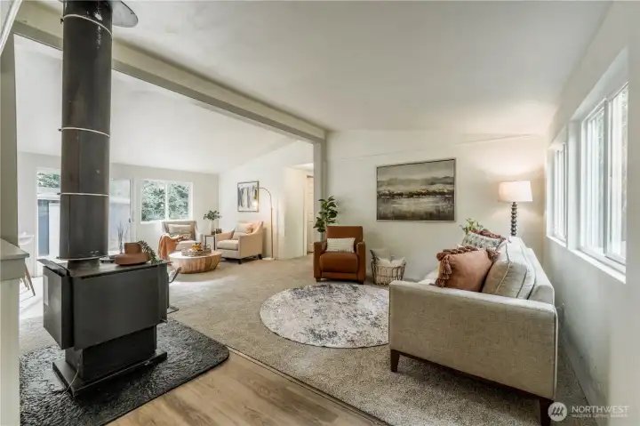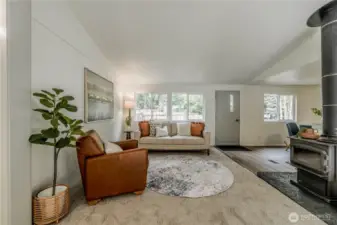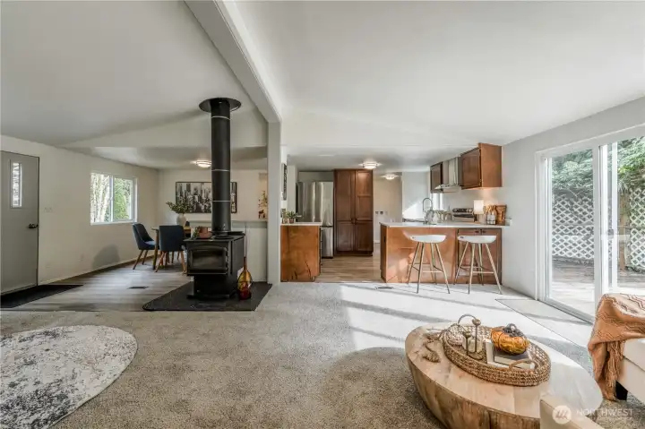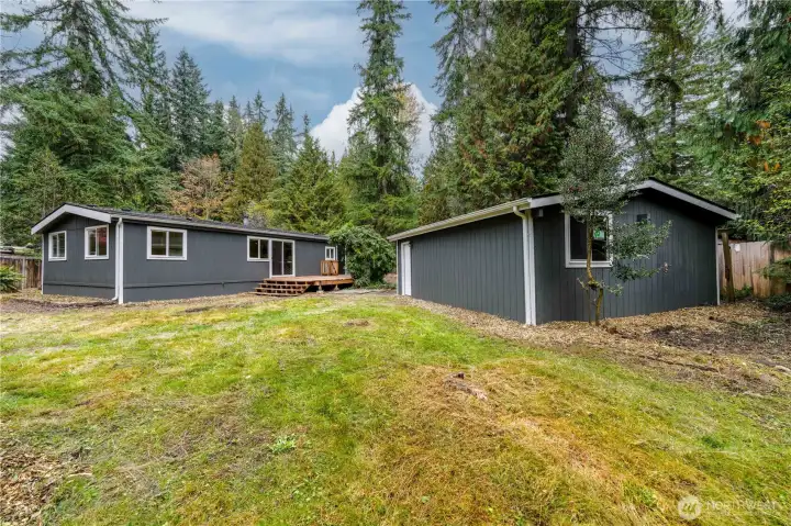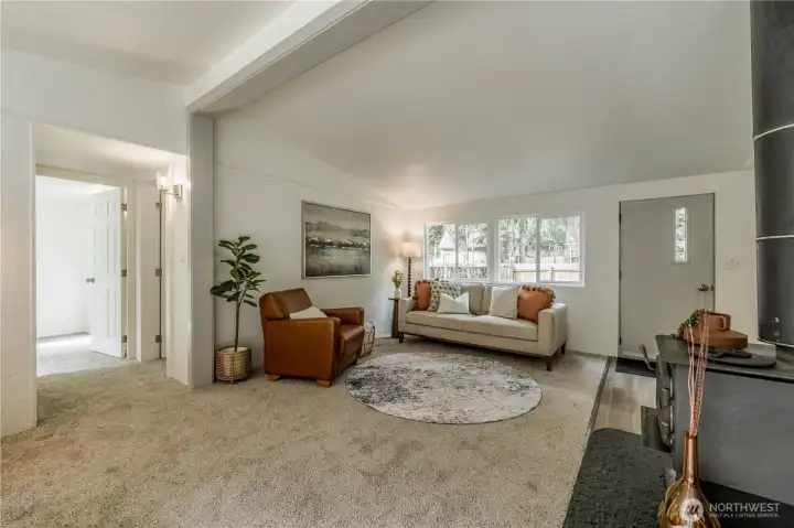Bright & Cozy Updated 3 BD 1.75 BA Home on Secluded 1/3 acre lot. Large Living Room W/ Vaulted Ceilings, Stand Alone Wood Stove. Primary Bedroom W/ Dual Vanity Under-mount Sinks & Quartz Counters & New Shower Surround. Updated Kitchen includes New soft Close Cabinets, SS Refrigerator, Electric Range, Dishwasher, Quartz Counters & Eating Bar. New Vinyl Windows, New Int. & Ext. Paint, Some New Doors & Trim, New LVP Flooring and Carpets. Updated Front & Back Decks. Large Flat Back Yard. Circular Driveway. RV Parking. 400+ sq ft Garage W/ New Roof. New Hot Water Tank and Electric Furnace. New Insulation & Vapor Barrier in Crawl. New Roof on the House. New PEX Plumbing in the Entire House. Fully Permitted Updates.