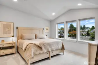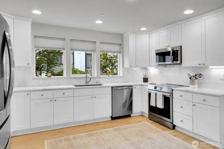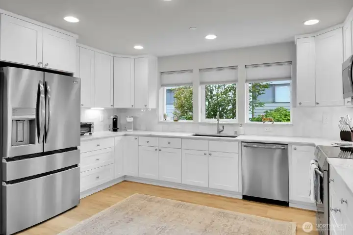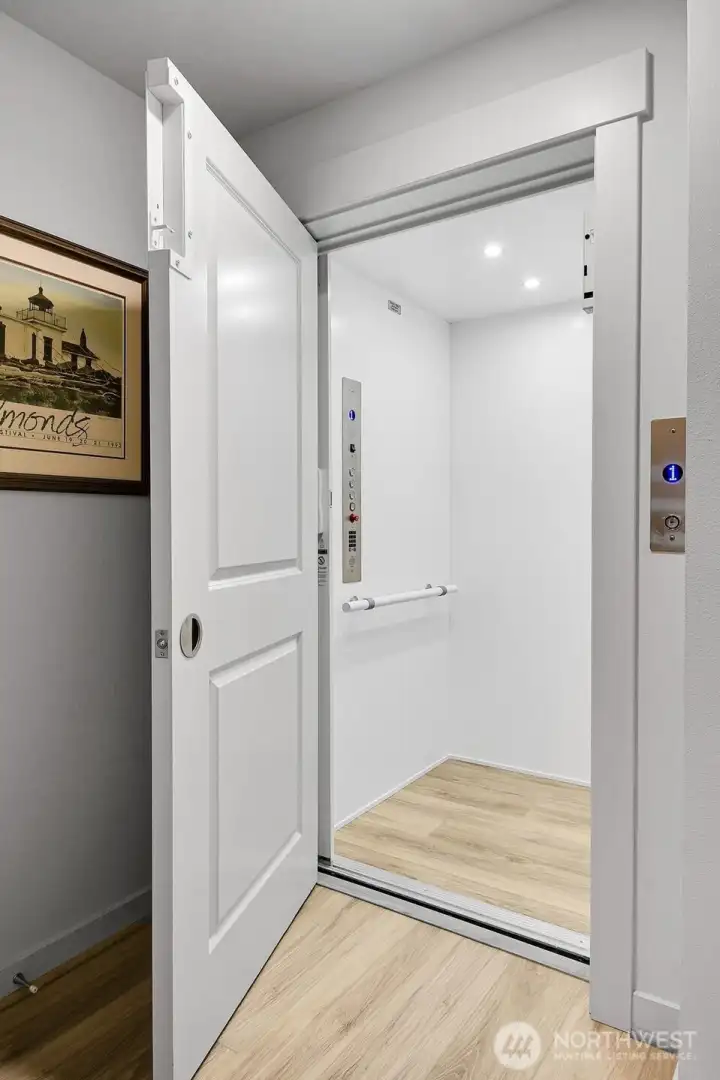 Nestled in the heart of the Edmonds Bowl this stylish 2-bed 1,919 SQ FT modern townhome w/ private elevator & 2-car garage offers the perfect blend of walkability & low-maintenance living. Private courtyard extends everyday living & entertaining outdoors. Airy open-concept main offers wide-plank floors & Juliet balcony. Bright kitchen w/ white shaker cabinetry, quartz counters, SS appliances & ample prep space. Two vaulted Primary Suite options! One w/ ¾ bath & dual closets the other w/ full bath & WIC. Enjoy territorial views throughout. Private driveway offers 3rd parking space. Mini-splits for yr round heating & cooling. Sink & cabinet in laundry room. Blocks from waterfront, parks, ferry, dining, shops, and the Saturday Farmers Market.