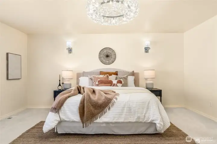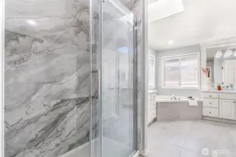 Imagine walking into this stunning East-facing luxury home while sunlight streams through the skylights onto gleaming genuine Marble floors and vaulted ceilings, French doors, illuminating custom cabinetry and dazzling chandeliers. The gourmet kitchen inspires with marble countertops and state of the art appliances. Be pampered with spa inspired bathrooms equipped with heated seats, jetted tubs, and bidets. While the primary suite spoils you adding a 5-piece ensuite and cozy fireplace. Large bedroom/office on main floor in addition to the 5 bedrooms upstairs make this ideal for generational living, guests, or home office. Top rated schools, shopping, restaurants and close to everything!