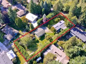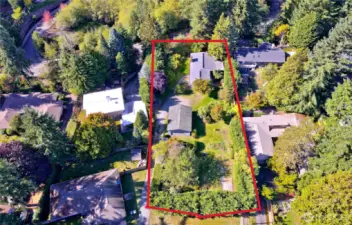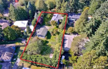 Well-built 4 bdrm, 2 1/4 bath home sitting on a rare 1/2+ acre beautiful private yard buffered by plantings & tall trees. Roses, fruit trees, berries. Home has been immaculately cared for w/ recent new roof & ducted Lennox gas furnace & heat pump/AC & electrical panel. New & recently new kitchen appliances, refinished hardwood floors, freshly painted interior & exterior. West facing deck, 2 wood burning fireplaces. Plenty storage plus detached 24x32 garage. More sqft in partly finished bsmt beyond the 1,680 sqft. City Middle Housing Ordinance allows 2 ADUs added as is. Zoned R6 potential subdivision into 3 lots. Current house built new 1961 on expanded foundation of original 1939 house. Northshore Schools. Unique one-of-a-kind property.