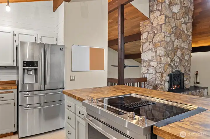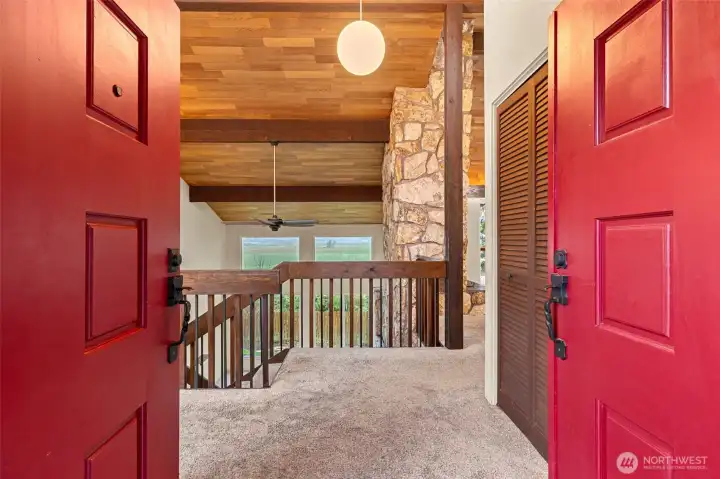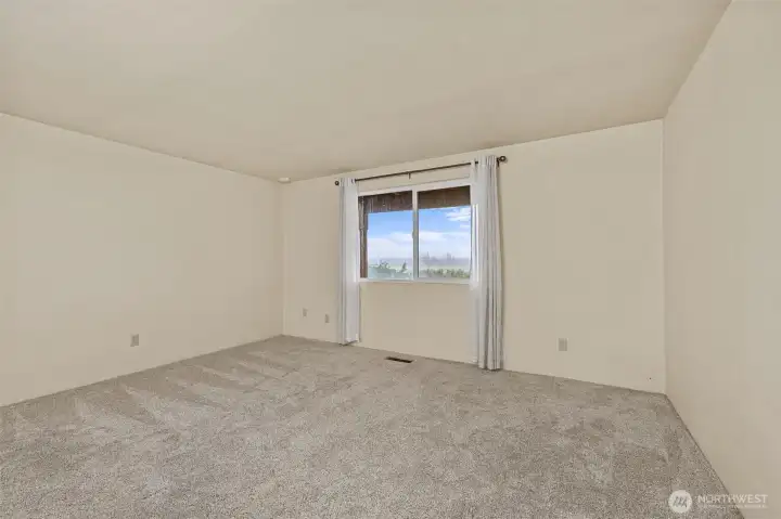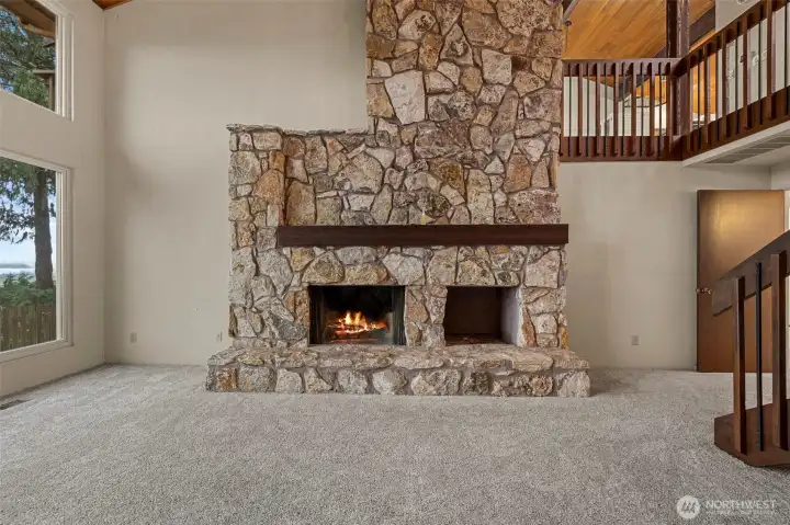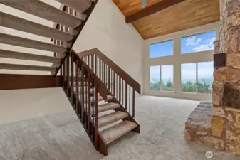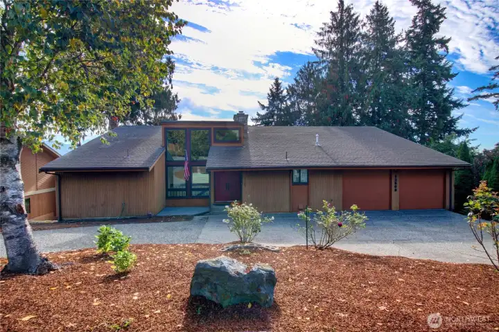 Perched above Skagit Valley farmland and adjacent to the golf & country club, this beautiful home offers panoramic views of North Cascades, sunrise skies, and migrating snow geese. The main level features vaulted cedar ceilings, a dual-sided stone fireplace, and a remodeled kitchen with butcher block counters and stainless steel appliances. Enjoy morning coffee or entertaining guests on the refinished deck overlooking the fields, gardens, fruit trees, and chicken coop. The lower level includes two bedrooms, an office, and family room with walk-out access. New Andersen windows (2025), newer HVAC with AC, and a fully fenced yard complete this serene retreat.