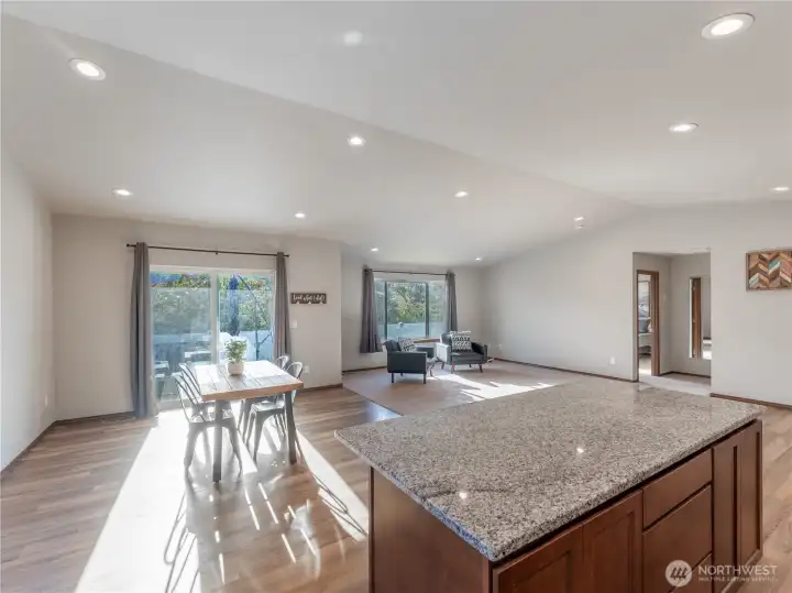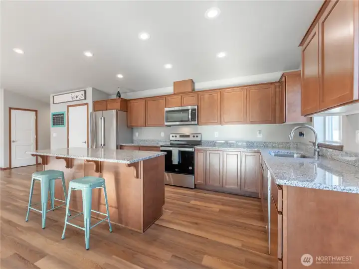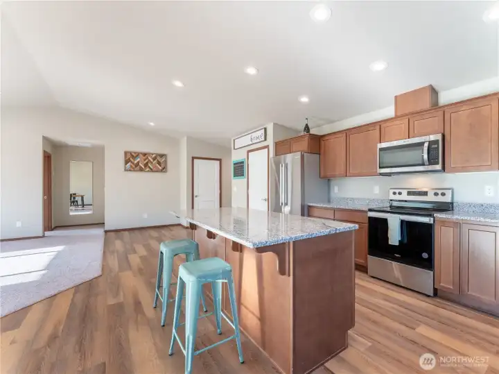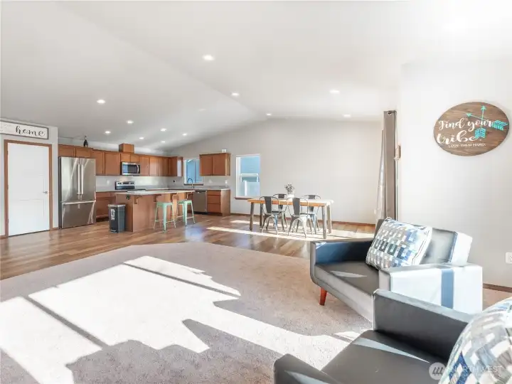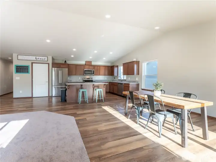 Better than new! This beautiful 3-bedroom, 2-bath rambler is move-in ready with upgrades & full landscaping already complete. Inside, enjoy fresh carpet in the living room & primary suite, vaulted ceilings & an oversized floorplan designed for comfort & privacy. The primary suite is separated from the other bedrooms, making it ideal for a home office or guests. Kitchen has LVP, an open layout & two pantries! Your backyard gate accesses the walking path-perfect for walks along the Rock Island Golf Course & Rock Island ponds. The ponds are not only scenic but also great for fishing, offering a peaceful place to cast a line. Residents also enjoy access to a launch on Hammond Lane, perfect for kayaks, paddleboards or relaxing days.