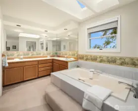 Coveted Edmonds Bowl living at the top of Elm Place this 2-bed home nestled on a corner lot = best views & privacy. Inviting soaring formal living room. Gas fireplace w/ brick surround, vaulted ceilings & hardwoods. Seamless flow to formal dining & kitchen. Enjoy Sound & Whidbey views while cooking + abundant storage. Casual dining space w/ sliding door opens to covered deck for yr-round enjoyment. Built-in buffets & pantry shelving. Guest bath on main. Upstairs features two Primary Suites options. One w/ an array of windows framing Sound, Whidbey, & Olympic views. Oversized! Enjoy a sitting area to unwind. 2nd suite has larger 5-pc bath w/ skylights, dual sinks & soaking tub. A/C. 2-car garage & welcoming front courtyard. Near it all.