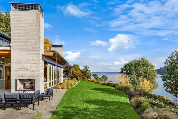 Architectural masterpiece at water's edge with south-facing exposure in tranquil Blakely Harbor. Designed by award-winning Miller Hull, featuring energy-efficient living with PV solar, solar hot water, radiant in-floor heat, and generator. Sustainably crafted with reclaimed wood, madrone paneling, fir, and concrete. Kitchen features Wolf, SubZero, Miele, German greenstone and stainless countertops. Walls of glass open to a stone patio with fireplace. Custom built-ins, gallery lighting, eco-luxury baths, and serene primary suite. Set on a shy acre with year-round sun, 400+ ft of waterfront, curated native landscaping, fire pit, and detached studio/guest space. Easy access to Blakely Harbor Park, Fort Ward, and miles of south end trails.