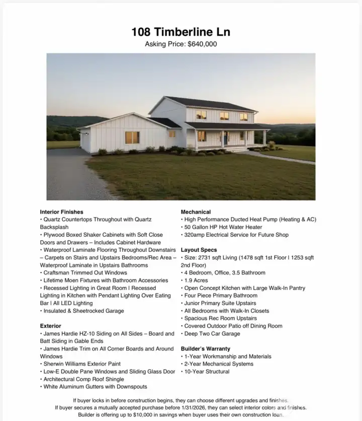New construction presale on 1.9 acres in a quiet, secluded neighborhood. Experience peaceful country living just minutes from I-5 w/ modern design & quality craftsmanship. 2,731 sqft home features 3 bedrooms, an office, 3.5 baths with an open-concept layout, primary suite on the main, large walk-in pantry, spacious rec room, & walk-in closets in every bedroom. High end finishes include quartz counters, soft-close shaker cabinets, waterproof flooring, craftsman trim, & recessed LED lighting. High performance ducted heat pump, solar panels, 320-amp service for a future shop, deep 2 car garage & covered patio for outdoor living. Builder offering up to $10,000 in savings when buyer uses a construction loan. Buy early to personalize finishes.