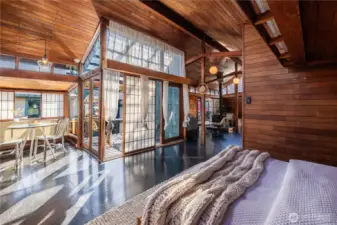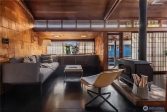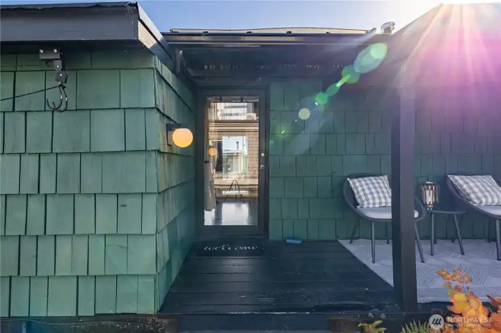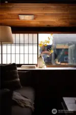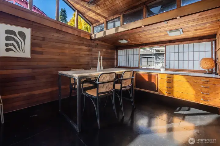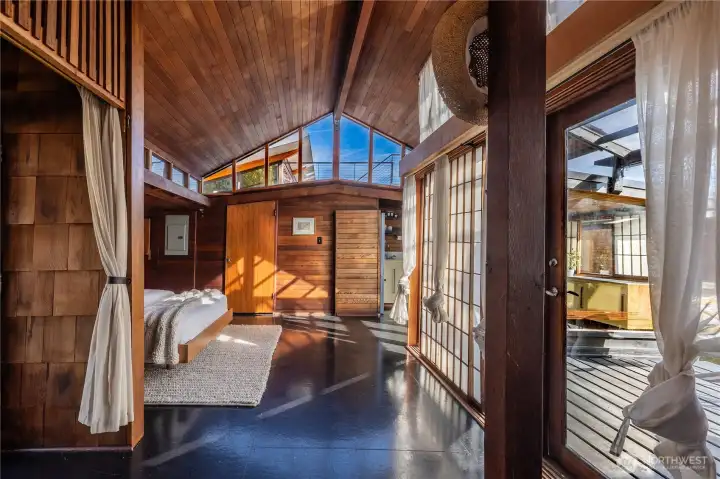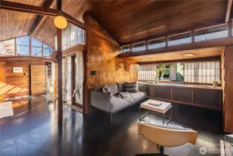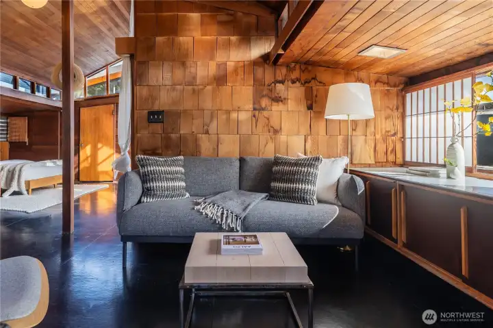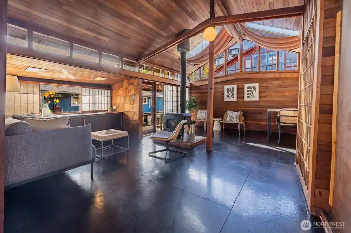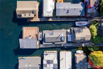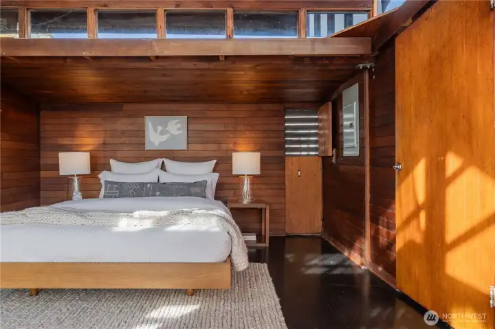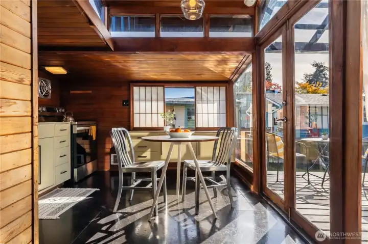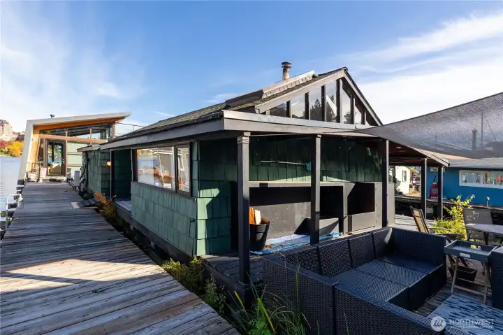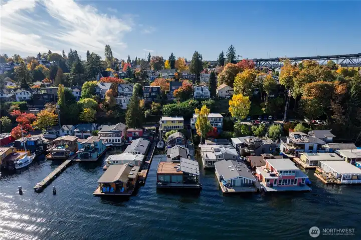 Designed by architect Gerald Van Slyck in the late 1950s to early 1960s, this distinctive floating home captures the essence of midcentury design with a NW sensibility. Vaulted ceilings, clerestory windows, and generous skylights welcome shifting sunlight that dances through the rooms & reflects off the water, giving the space a luminous, ever-changing quality. Outdoor areas frame tranquil Portage Bay views, while the intimate four-home co-op dock offers a genuine sense of community. Includes one dedicated parking space & a 43-foot moorage slip - a timeless blend of architecture, light, & waterfront serenity. Second from the end, this is your perfect retreat from the daily city life putting you absolutely in touch w/ nature at it's best.