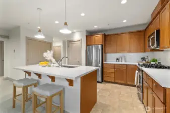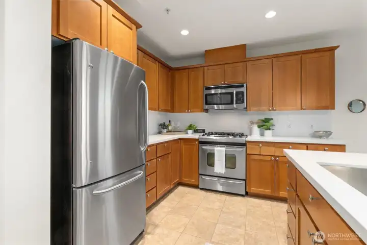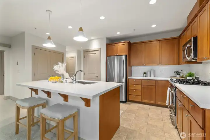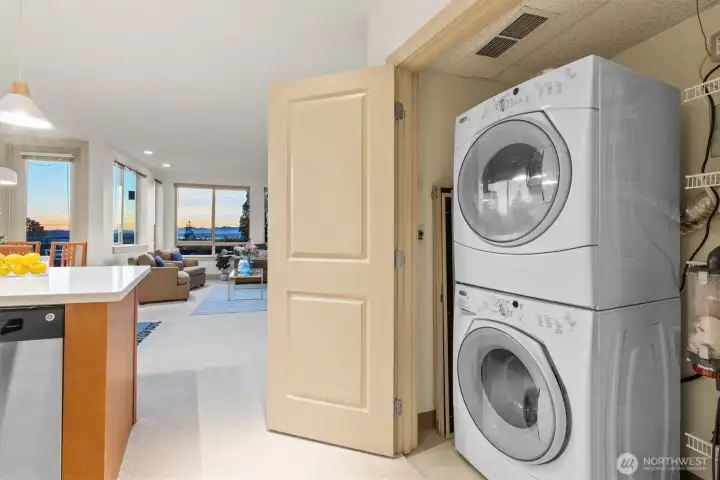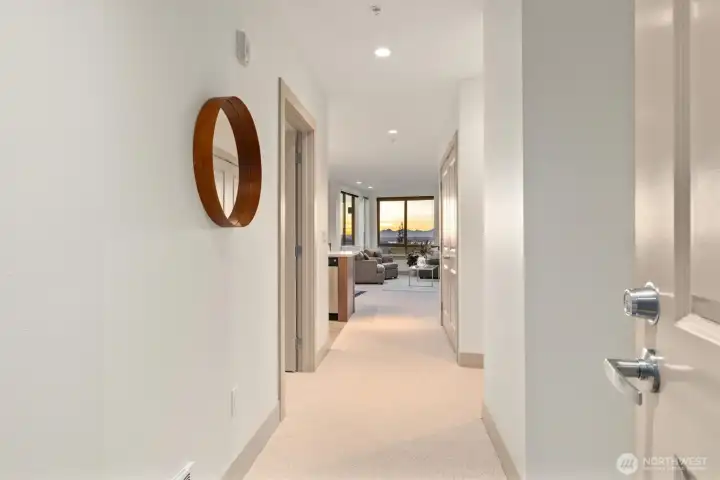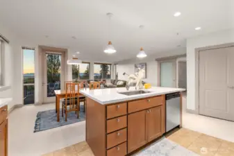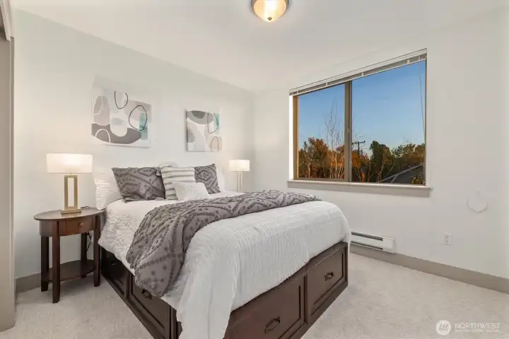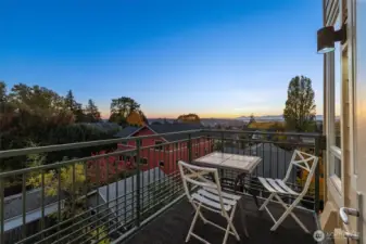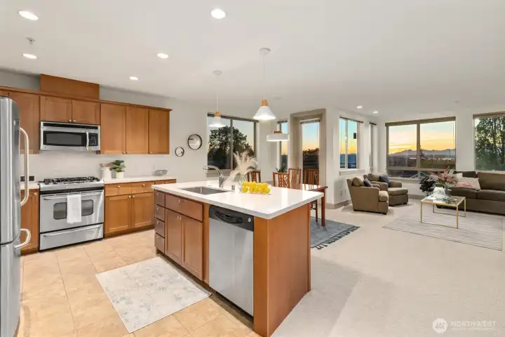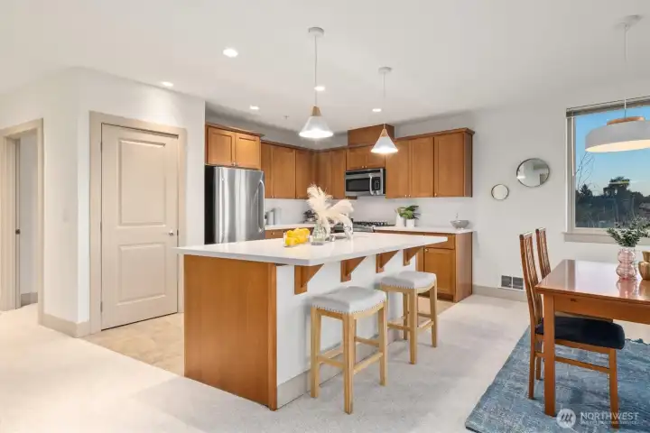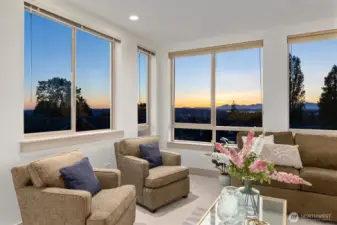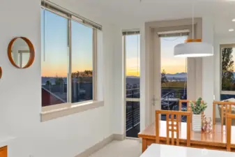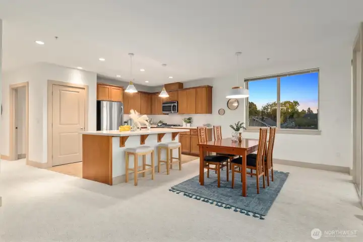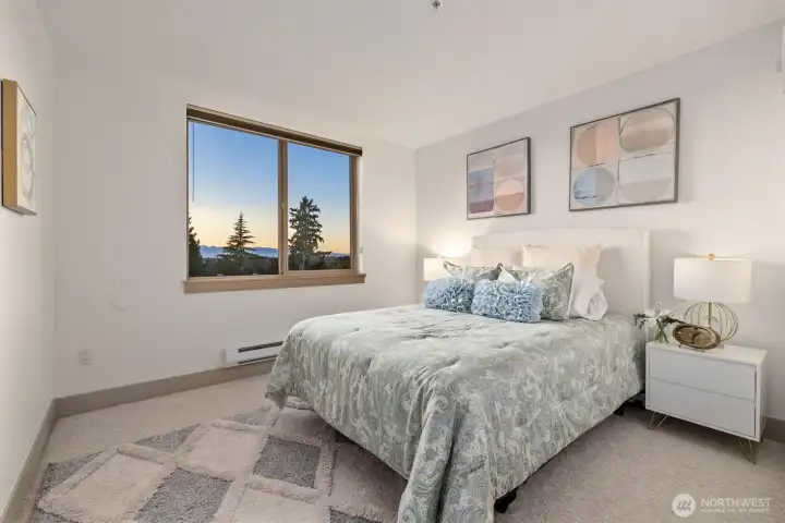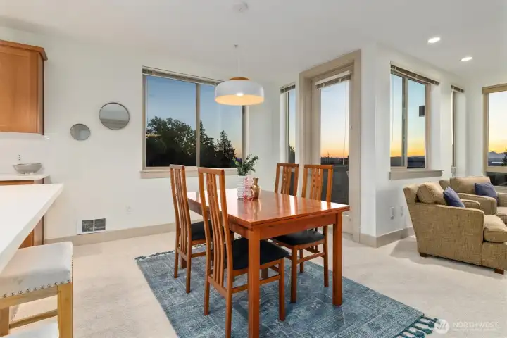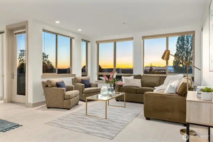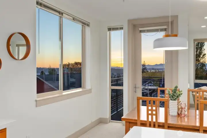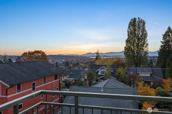 Perched atop Phinney Ridge, this 2-bedroom, 2-bathroom plus den, southwest-corner home showcases unobstructed Olympic Mountain and sunset views from nearly every room. One owner since new and freshly updated with new carpet, paint, countertops, and backsplash, it feels like new. The open layout fills with natural light and offers spacious living and dining areas plus a private balcony for endless sunsets. With two secure parking spaces and an unbeatable location—Petit Pierre in the lobby and Red Mill, Ken’s Market, and Greenwood Hardware just steps away—this home combines incredible views, privacy, and walkability in the heart of Phinney Ridge.