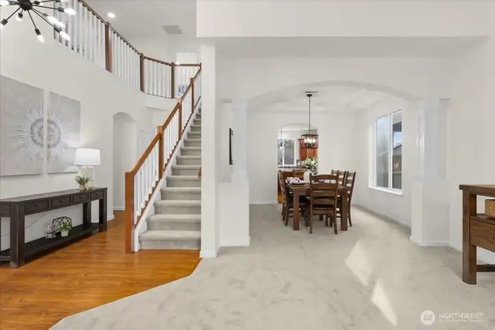 Nestled in the picturesque, tree-lined neighborhood of Rainier Vista at Jenkins Creek, this beautiful 2-story gem offers 2,600 sq ft, 5 beds, 2.5 baths and is absolutely TURN-KEY! Main floor welcomes you w/ vaulted ceilings into a light-filled living room that seamlessly flows into the dining featuring elegant arches & columns. Kitchen features SS appliances, large island & eating area that opens to the great room w/ cozy gas fireplace—perfect for gathering this holiday season! Upstairs, discover 5 spacious bedrooms including the primary suite. Updates include new carpets, paint, light fixtures. A/C, tankless water heater & EV-ready outlet. Walk to schools, Covington Community Park, Aquatic Center and the future Lakepointe Urban Village.