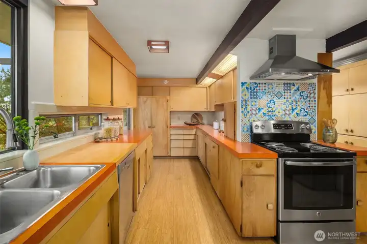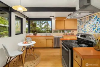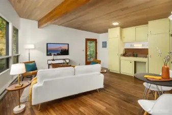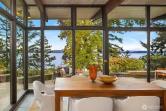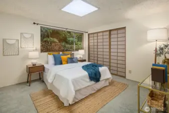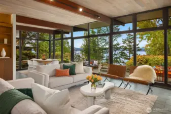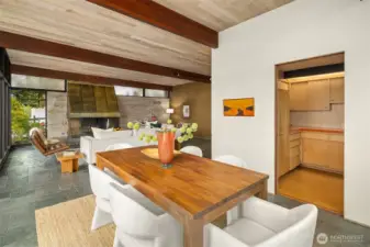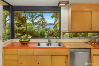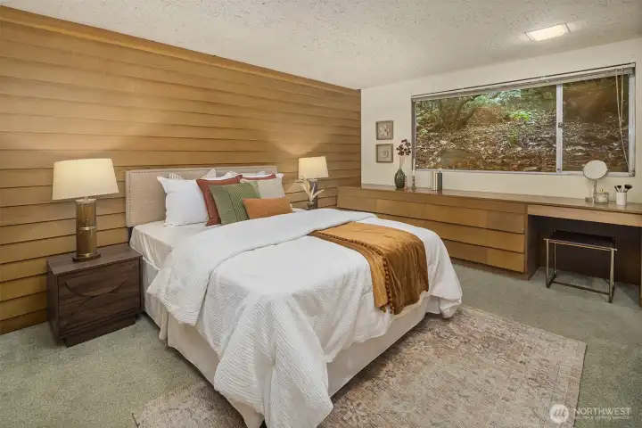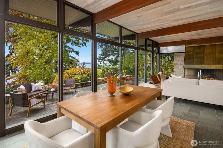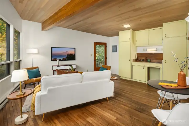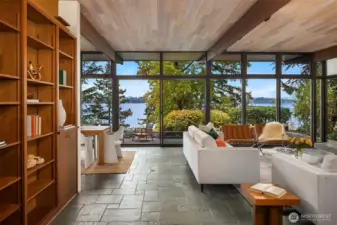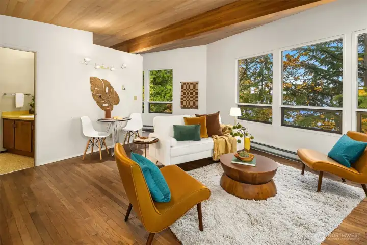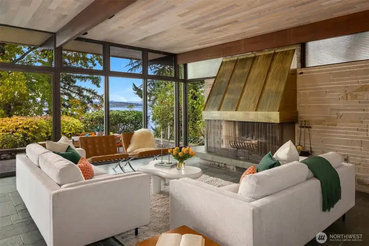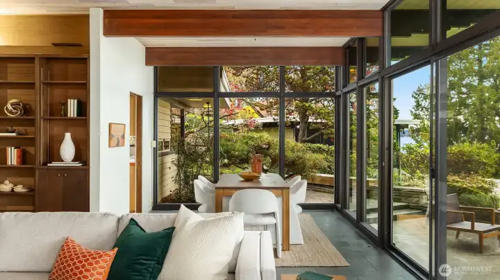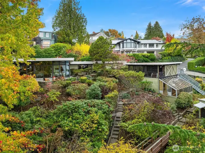 Featured in the Seattle Art Museum's 1955 Architectural Tour, this John Ridley designed residence captures the essence of the Pacific Northwest modernism, elegant, natural and timeless. Every element reflects mid-century style with original details including a striking copper fireplace with cantilevered hearth, terrazzo and slate floors, shoji screen doors, solid wood ceilings with exposed beams and warm tones throughout. Open living area with floor to ceiling windows, Lake Washington views and bedrooms with en-suite baths. below, a separate guesthouse offers additional space, kitchenette, and 3/4 bath with sweeping views. Bring your vision to restore this rare mid-century gem to it's architectural glory. Close to U-Village, Burke Gilman.