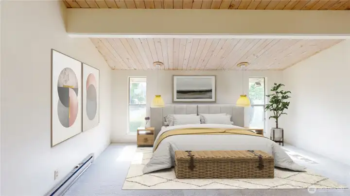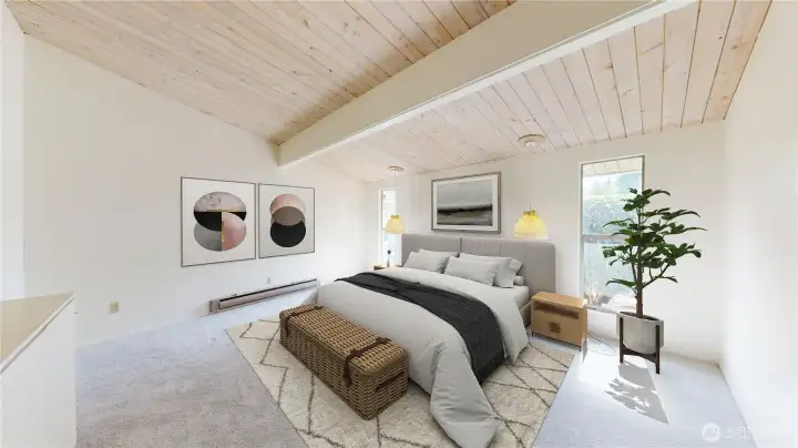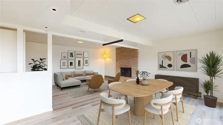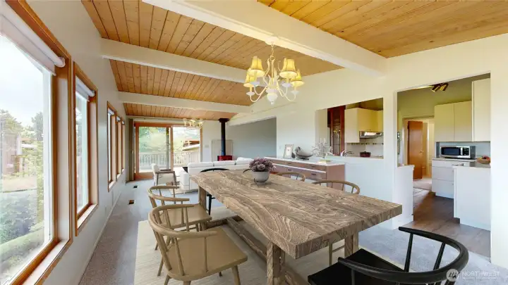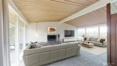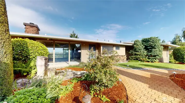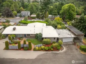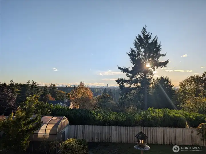 Welcome to this peaceful neighborhood with clear views of Mount Rainier and the Cascades from the spacious dining and family rooms! A lovely water feature greets you at the entry. This popular Mid-Century Modern home offers a newly updated lower-level MIL suite with full kitchen, laundry, and direct access to a large patio. Features include a heat pump, central vacuum, fireplaces up and down, hardwood floors under carpeting, and a charming wood stove. The fully fenced backyard showcases established roses, fruit trees, and a playhouse, with covered RV parking along the south side. An oversized heated two-car garage includes EV charging, plus an additional carport. Offered by the original owners, this home is ready for new memories!