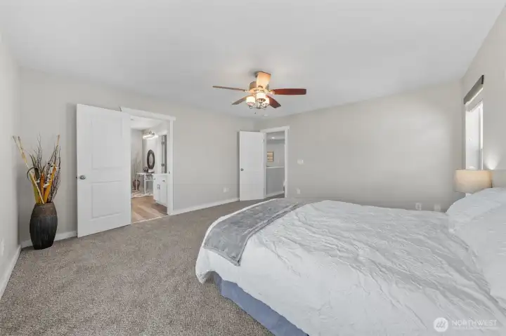 This one stands out from the crowd with custom touches throughout. All new carpet and interior paint in grey tones with LVP in all wet areas. Recent updates in the kitchen include white quartz countertops, two-tone cabinets, an island with eating bar, stainless steel appliances, and walk-in pantry. Kitchen opens to the living room with a cozy gas fireplace. All bathrooms have updated flooring, fixtures, and vanities. Upstairs there are 3 good size bedrooms, all with WIC's, and a loft for hanging out in the middle. The primary bedroom is huge and the bath features a soaking tub and glass enclosed shower, plus you may need more clothes to fill this closet! Backyard is fully fenced with an oversized patio for relaxing at the end of a long day.