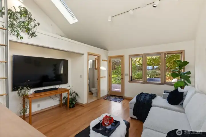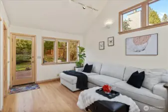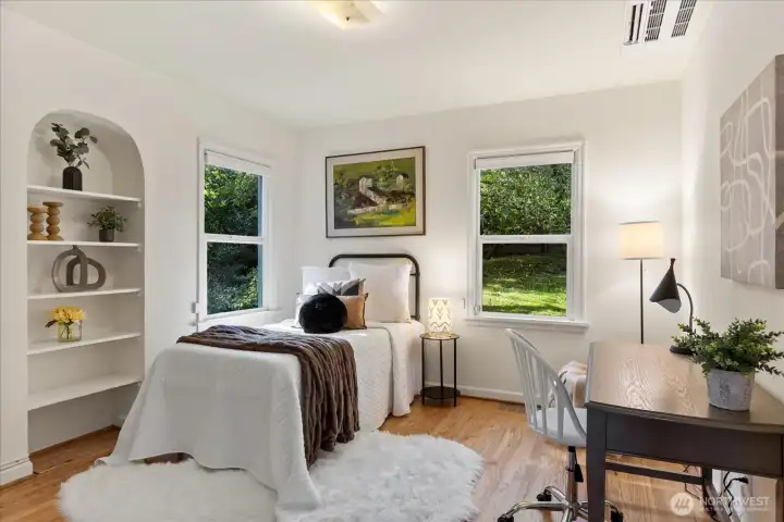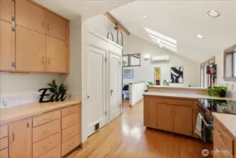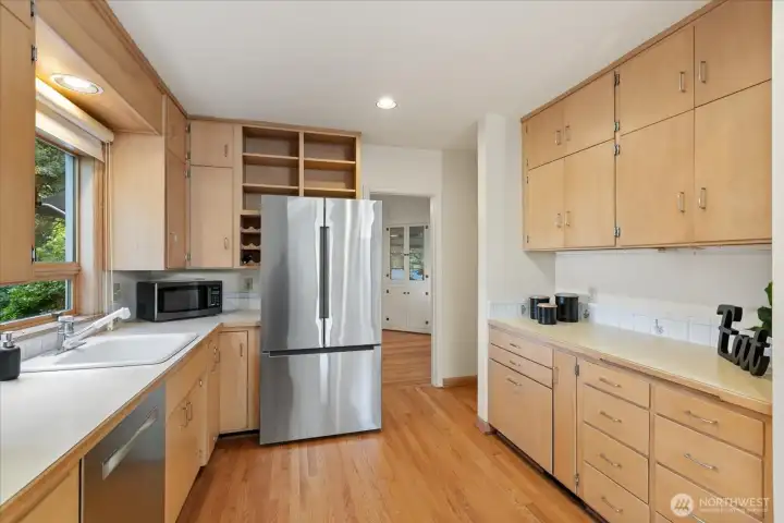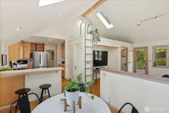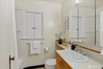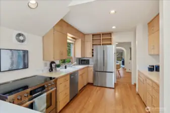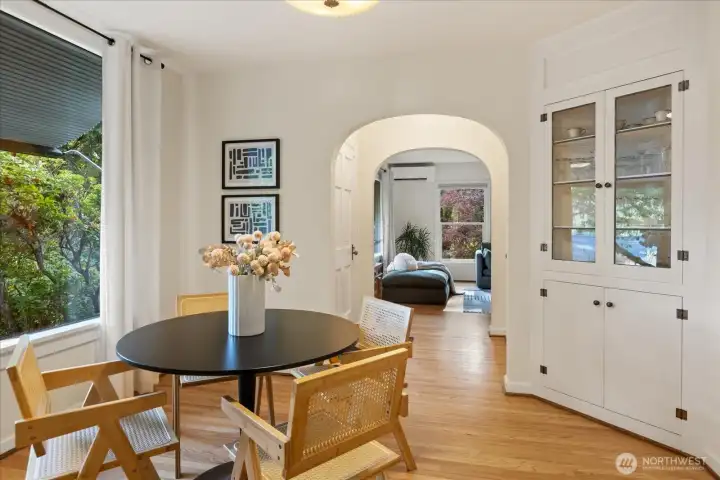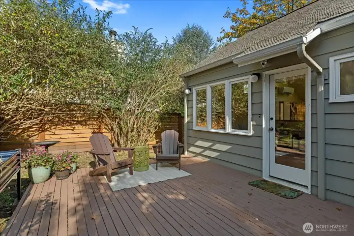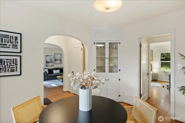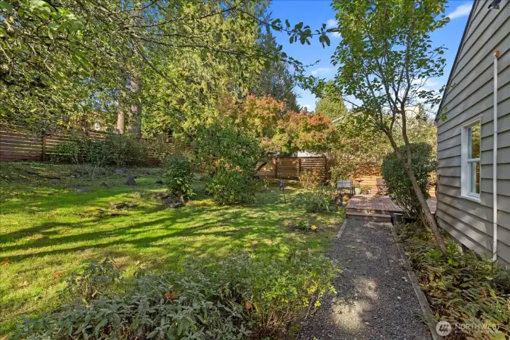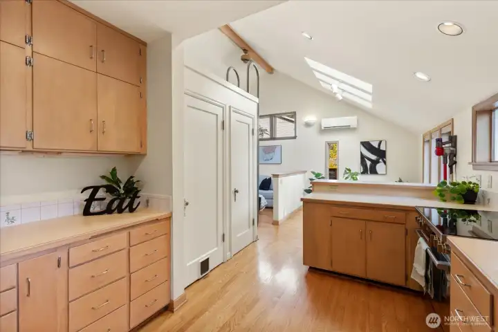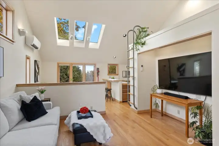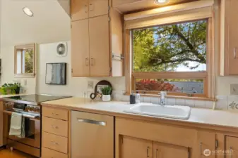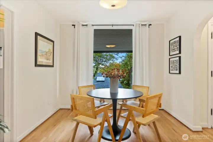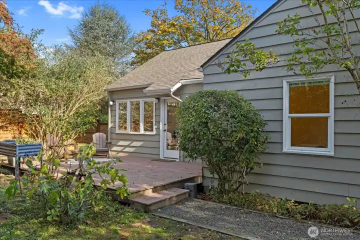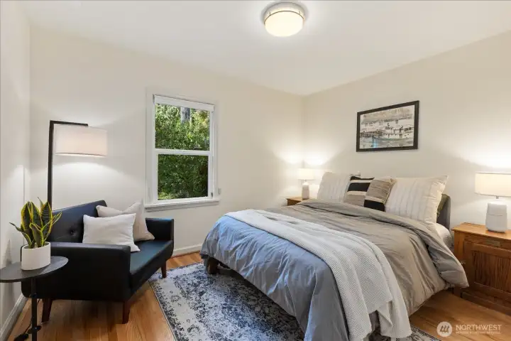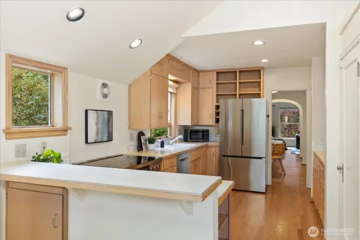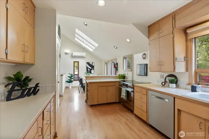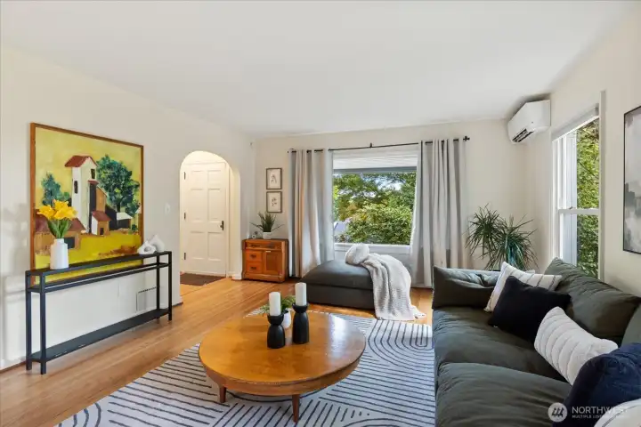 Charming 1938 cottage with beautiful Cascade Mountain views! Cathedral-ceiling skylights fill the home with natural light, while hardwood floors and period details bring warmth and character. A permitted remodel expanded the kitchen, added upgraded windows, a living room feature wall, and mini-splits. Electrical system completely rewired and installation of a whole-house surge protector. The kitchen shines with top-end Bosch appliances and ample storage. The large, private lot offers a deck for entertaining and terraced backyard with fruit trees and room for your green thumb. Partially finished basement provides excellent potential to expand. Ideally located near shopping, dining, Matthews Beach & Magnuson parks, Green Lake, and light rail.