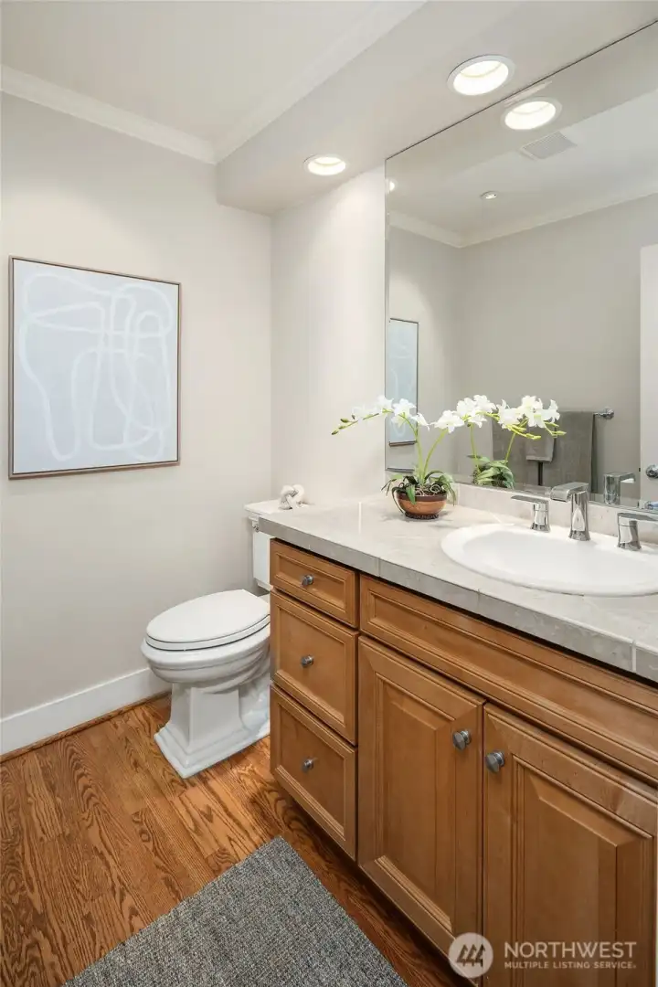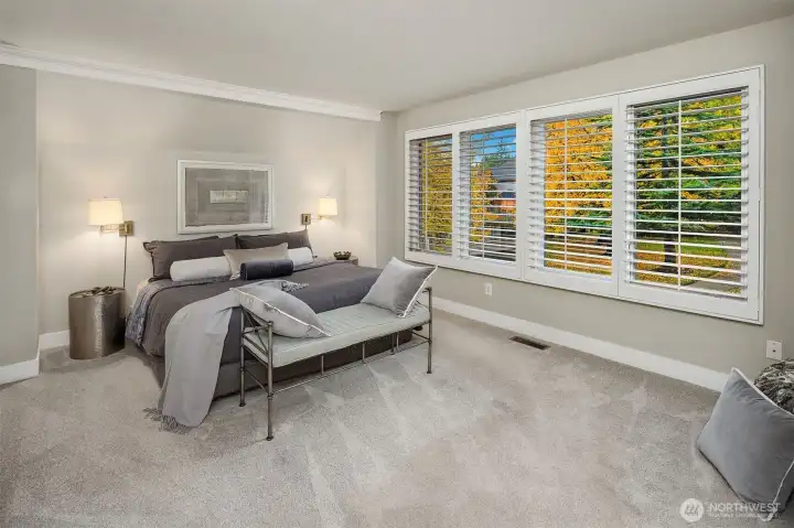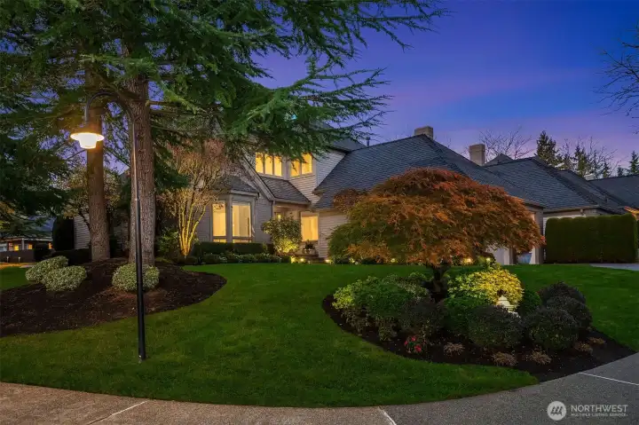 Experience refined living in this sought-after gated community, located just blocks from downtown Bellevue. This elegant townhome lives like a single-family home, offering a rare large corner lot and exceptional privacy. A beautiful entry opens to soaring ceilings and formal living and dining spaces that exude timeless style. The kitchen features slab granite countertops, stainless steel appliances, and an adjoining family room. Step outside to a private patio ideal for indoor-outdoor dining. A main-level bedroom provides flexibility for guests or a home office, while upstairs features a luxurious primary suite overlooking a view of manicured lawns. The secondary bedroom serves as a guest suite. Elegant Home - Premier Bellevue location.