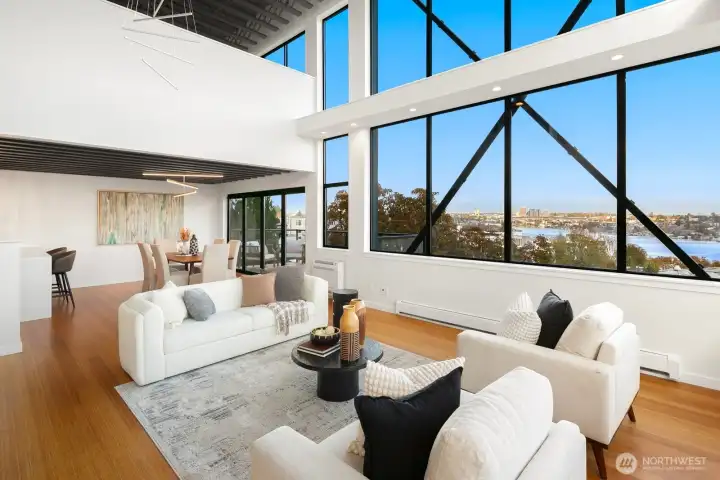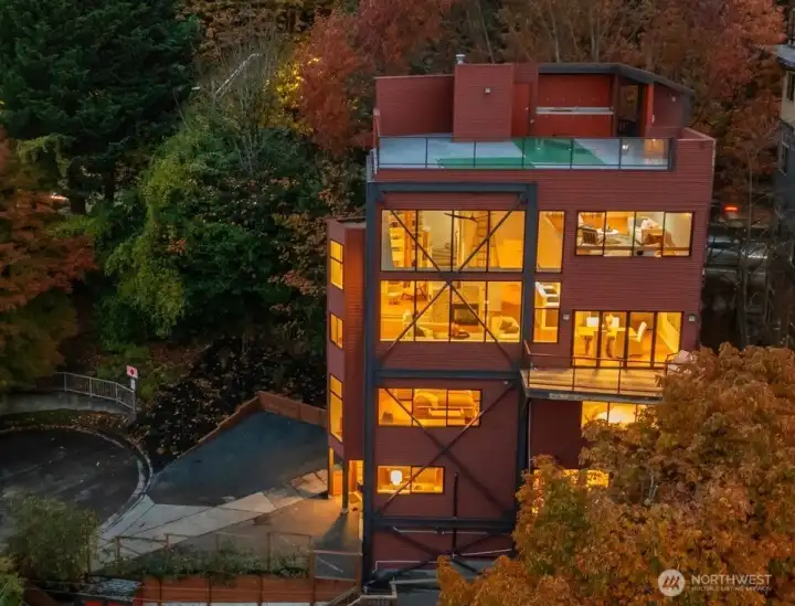 Iconic modern home in Westlake w/ unparalleled views of SLU, Downtown Seattle & the Cascade Mt range from every floor of the house! Privately situated on a dead-end cul-de-sac with abundant parking this home was custom built for entertaining w/ a chef's kitchen, expansive rooftop deck, & large mezzanine w/ 270 degree views that can host a dinner party seating over 50+ people. Warm natural finishes throughout including bamboo floors, custom wood built-ins & Murphy beds. House has an elevator to 6 levels of living including a level w/ ADU unit with 1 bedroom. Tech-wired house with ethernet/coax to every room. Landscape includes an outdoor garden bed & fruit orchard. Rare floorplan in walking/biking distance to Fremont, SLU, Downtown & more!