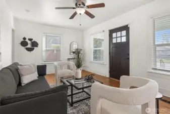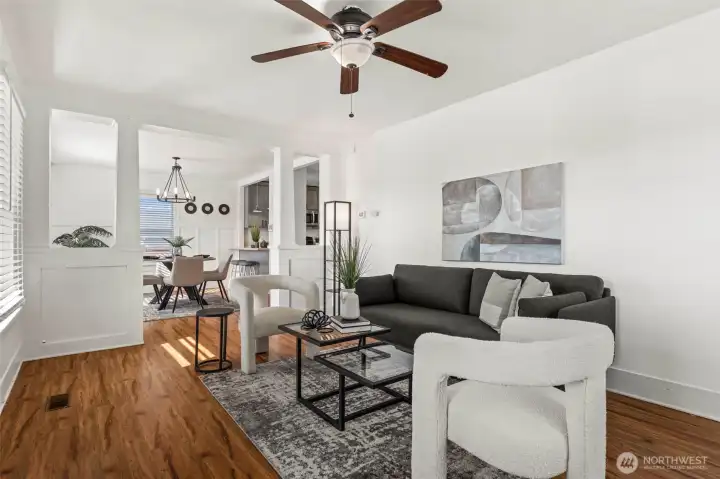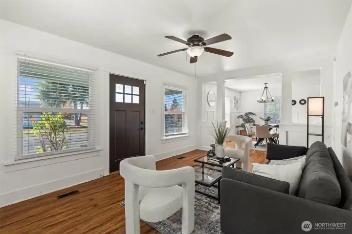 Remodeled craftsman-style home featuring main level living, bright kitchen with white quartz counters, stainless steel appliances & new cabinetry. The spacious main-level bath includes tiled flooring, a new vanity, and a beautifully tiled shower. Enjoy new flooring and windows throughout for a fresh, modern feel. The primary suite is on the main & second bedroom and large loft upstairs—perfect for a third bedroom, office, or flex space. Situated on a large corner lot with street and alley access, offering plenty of room to build a DADU or garage.
