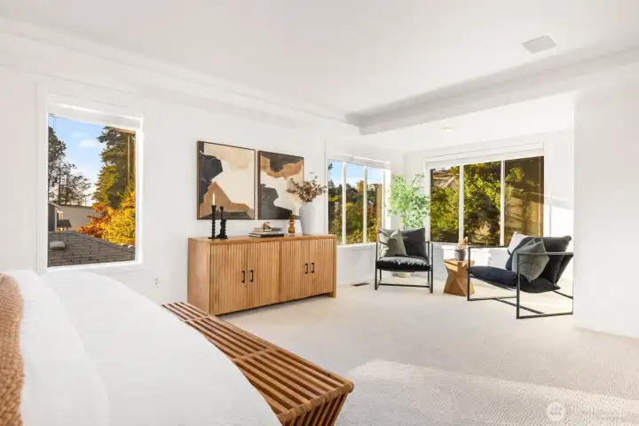 Stunning showstopper NW Contemporary home, recently remodeled with fresh paint and designer finishes blending timeless elegance with modern luxury. Sunlit interiors boast soaring ceilings, skylights, and a chef's kitchen featuring sleek quartz counters, premium stainless appliances, spacious pantry, and island flowing to the living room's cozy fireplace. Rich hardwood floors throughout, plus brand-new carpet, new water heater, new furnace, and an oversized 3-car garage. Lush manicured grounds feature a covered gazebo, paver patio, and expansive rooftop deck with stunning views. Nestled in the desirable Genesee neighborhood, it's steps from The Junction, Alki Beach, Lincoln Park trails, top schools, shopping, and dining—all at your doorstep.
