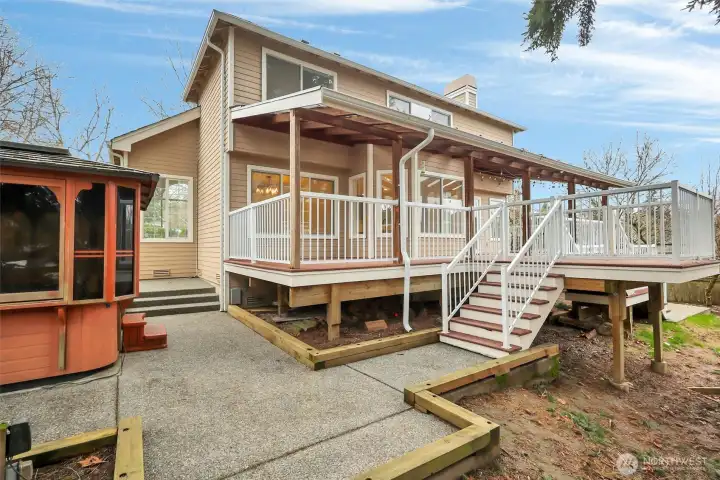 Raising more than just your standard of living, then you will appreciate tree shaded, enclave of well cared & quiet cul-de-sac neighborhood that comes with/ 2040 sqft, 4BR, 2.25 bath on Fill Hill. Home offers kitchen opens onto delightful large TREX deck w/veranda, separate formal dining room area, living room with vaulted ceiling. Family room with/fireplace & 2 car garage. Highly regarded LK WA School District. Dogs will love bunking in their own safe fenced w/sun drenched garden & fruit trees. Large covered patio with hot tub & cabana for gathering. New LVP flooring & carpet. New doors, baths & paint. New light fixtures in dining and kitchen room. Updated roof & heating/cooling system. New driveway. Best at surprisingly modest price & easy access.