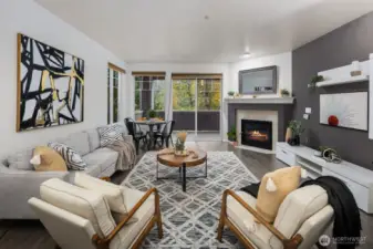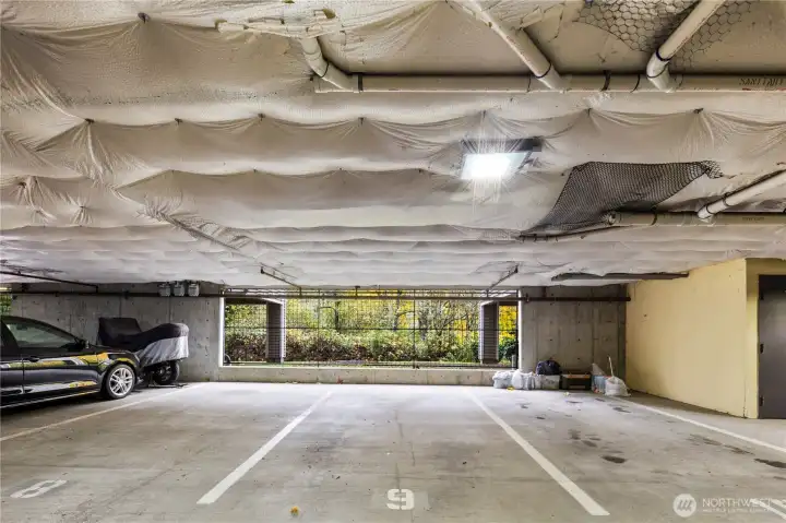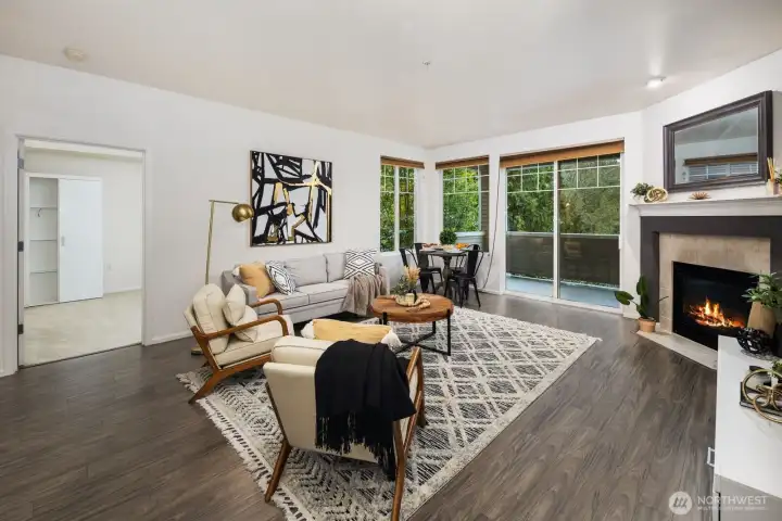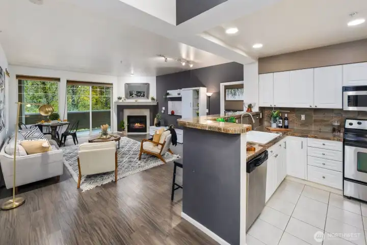 Stylish 2 bed 1.75 bath condo in desirable Bellevue location! Secure building with assigned garage parking spot below and extra assigned spot out front with guest parking abundant. This first-floor unit elevated above the garage offers easy move in access while providing private peaceful views of the lush greenbelt. Thoughtful touches include high ceilings, gas fireplace, and newer flooring + paint. Kitchen boasts stainless steel appliances and bar seating. Spacious primary suite offers a walk-in closet and large en-suite with double sinks. Community amenities include: outdoor pool, hot tub, gym, business center, and clubhouse. Sought after Bellevue school district and quick access to I-90, I-405, & Downtown.