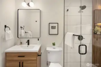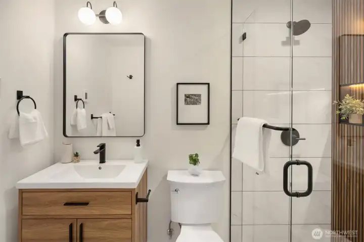 Impeccably designed & expertly crafted, this fully renovated midcentury blends timeless charm with luxury touches. Large windows flood the living room with light. Open kitchen features large pantry, under-cabinet lighting, stainless steel appliances, wood cabinets & quartz counters. Dining room opens to back patio. Main floor includes 2 bedrooms, including primary w/ en-suite bath, and guest bath. Downstairs, an additional primary w/ walk-in closet makes an ideal guest suite or multi-generational living. Expansive media/bonus room w/ acoustic media wall and built-in shelving, convenient home office, & laundry room with ample storage and stainless-steel sink. Convenient location near transit, I-5,restaurants and shops, all on a quiet street!