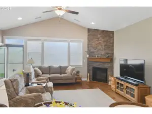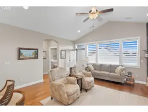 Living is easy in in Whipple Creek! Welcome to a highly sought-after 55+ gated community offering comfort, style, and convenience. This inviting single-level home with 2 bedrooms and 2 bathrooms has elegant archways, high ceilings, and high-end finishes throughout. Open floor plan, engineered hardwood floors, a cozy gas fireplace, and air conditioning. The kitchen with a large granite island, stainless steel electric appliances. Custom blinds and Roman shades. Primary suite has walkin closet and roll-in shower with a seat and grab bar. Storm doors, railing on the front steps, sidewalks, and a laundry room with sink. Low-maintenance backyard with turf, a raised garden bed, and an extended patio cover. Experience easy living at Whipple Creek.