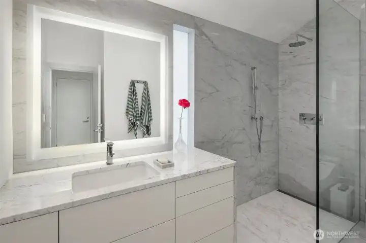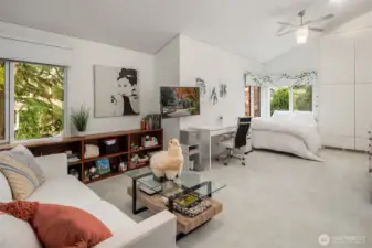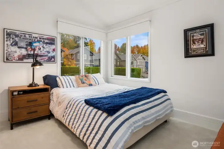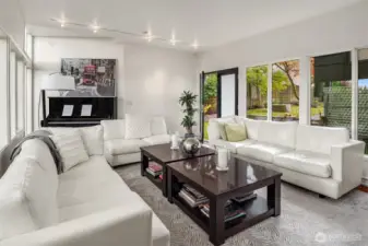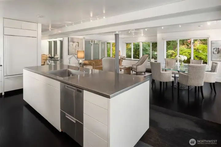 Designed by Lee Copeland & featured in AIA Guide to Architecture, this chic abode sits quietly behind lush plantings, offering privacy & architectural intention. Known as Chez Beech, glass walls frame a sculptural beech tree, inviting a dialogue w/ nature. Sophistication meets refined craftsmanship: high-end appliances, custom rosewood, smart built-ins. Chefs kitchen w/ stainless island, oversized sink, deep soft-close drawers, bar sink & new Wolf range opens to living & dining. Upper level hosts a primary suite w/ skylit spa bath, heated floors & deep tub. 2 add’l bedrooms share heated bath. Gym, office, media room, temp-controlled 800+ bottle wine cellar, turf lawn & garage. Timeless design & unique landscaping in coveted Madison Park.