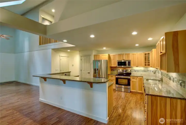Enjoy loads of natural light and an easy access entry into this custom built 3-bedroom home - with office. Built in 2001, the home is located on a large double lot, has an open floor plan, and the primary bedroom & office are on the main level. The open kitchen has stainless steel appliances, walk-in pantry, slab granite counter tops, and a large island - which is wonderful for entertaining! The great room area has soaring ceilings, free standing gas stove, and access to the private rear deck. The primary bedroom has updated full bath (separate bath and shower) and walk-in closet. Updated heating / cooling system. A large 2-car garage and double lot complete the home. Nicely landscaped property.