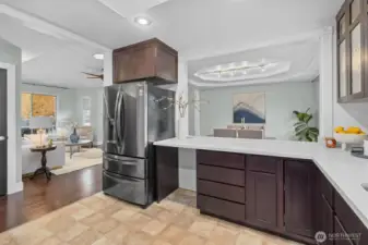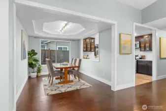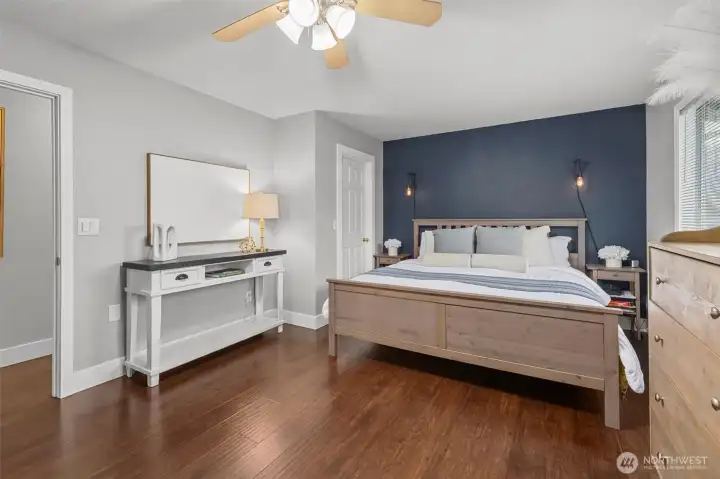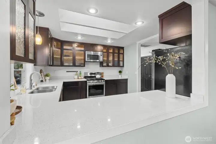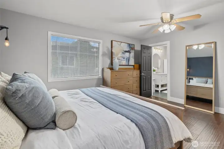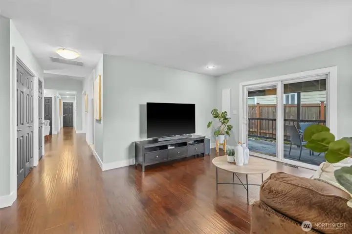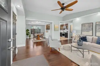 Experience refined single-level living in this beautifully updated home. A bright living room with vaulted ceilings welcomes you, while the family room with a gas fireplace adds warmth and comfort. The kitchen features stainless steel appliances, a 5-burner gas stove, and a new Bosch dishwasher, opening to a dining room with a coffered ceiling. Remodeled baths, skylights, new trim, laminate hardwoods, newer gas furnace, and A/C ensure year-round comfort. Enjoy the covered deck, hot tub with gazebo, lush gardens, planter beds, apple trees, berries, rhubarb, and chicken coop. Two-car garage, additional parking for an RV & boat, complete this Northwest retreat. 1yr Home Warranty.