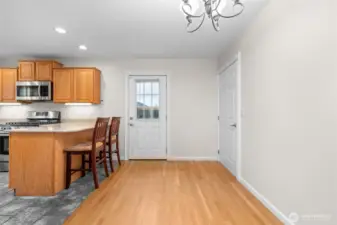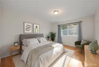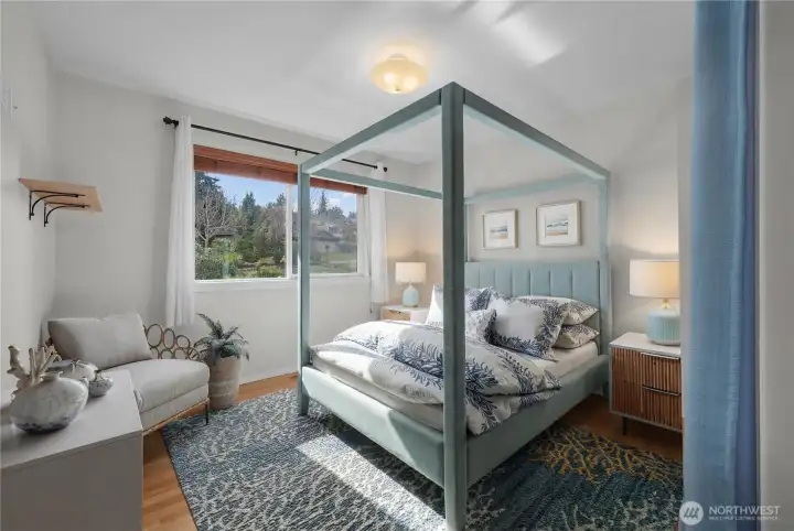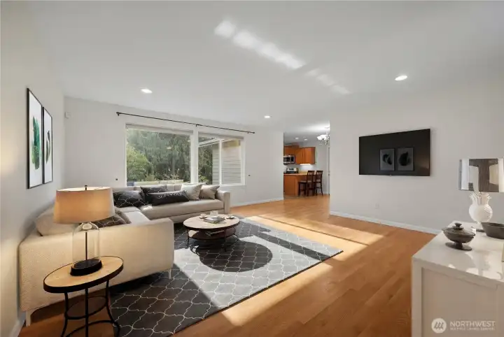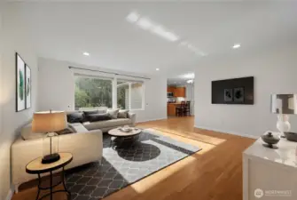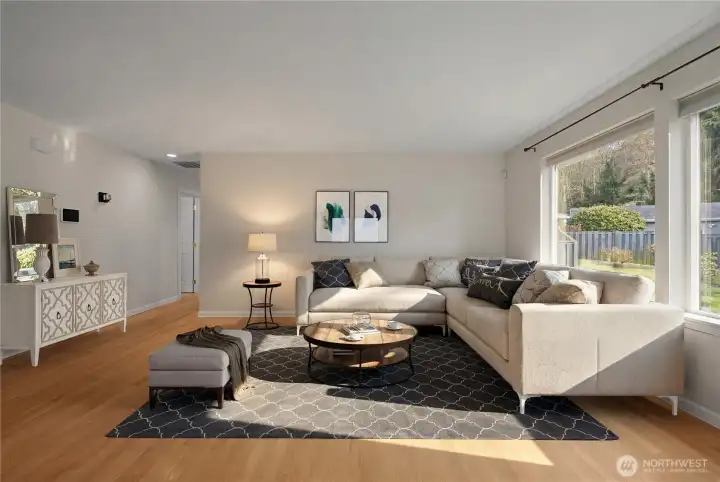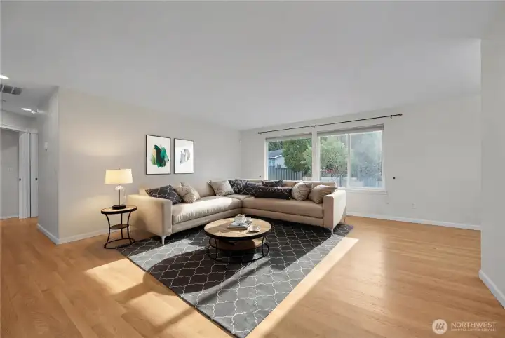 Set on an expansive lot with partial water views, this beautiful single-level home offers a timeless layout enhanced by oak hardwood floors throughout. Sunlight fills the south-facing living room and kitchen, where views extend over the fully fenced backyard, complete with planters and irrigation. The open design creates an inviting sense of space, complemented by a generous mudroom with laundry for everyday ease. Additional amenities include a west facing deck off the kitchen, a fully finished garage, newer furnace, water heater, interior paint and a level driveway. Located in Skyline with quick access to the airport, marina, WA Park, WA ferries, a sandy community beach, tennis courts, pickleball courts, and a waterfront cabana.