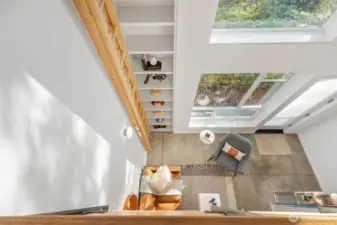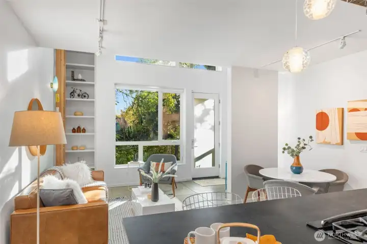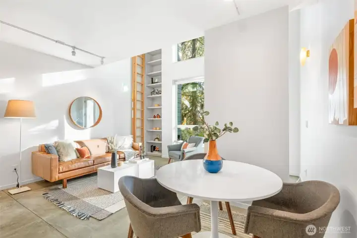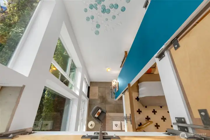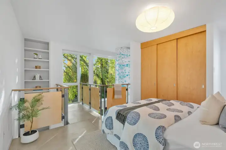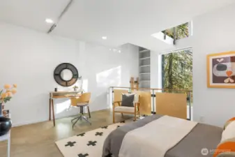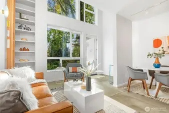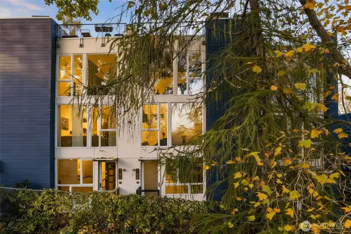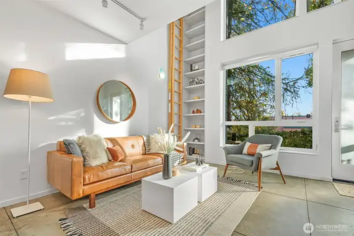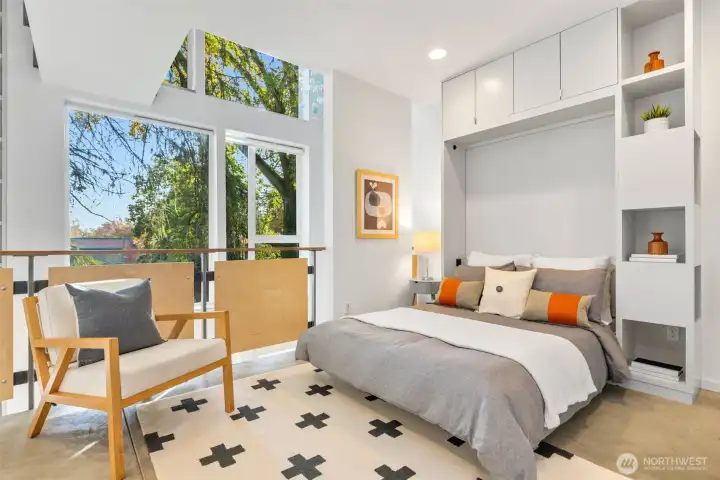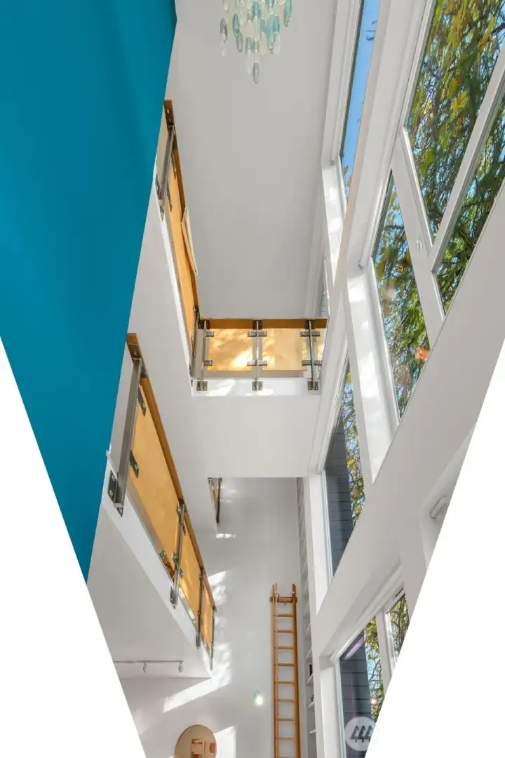 Soaring 30’ ceilings and walls of glass define this 5-Star Built Green home perched above Miller Park on one of Capitol Hill’s most coveted streets. Thoughtful, modern design blends warmth and sustainability through radiant concrete floors, maple cabinetry, and triple-pane windows. A sculptural bookcase grounds the kitchen and living area, illuminated by designer lighting. The top-floor primary suite opens to treetop views across an interior bridge to the dramatic window wall, while a flexible, light-filled second bedroom with Murphy bed floats above the living space below. Enjoy mountain views from the rooftop deck and a prized location moments from Monsoon, Hello Robin, Rocket Taco, and other neighborhood favorites.