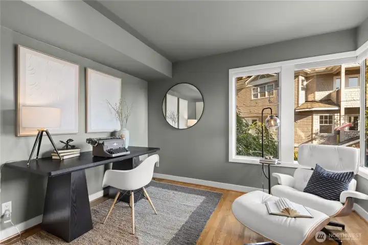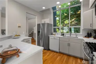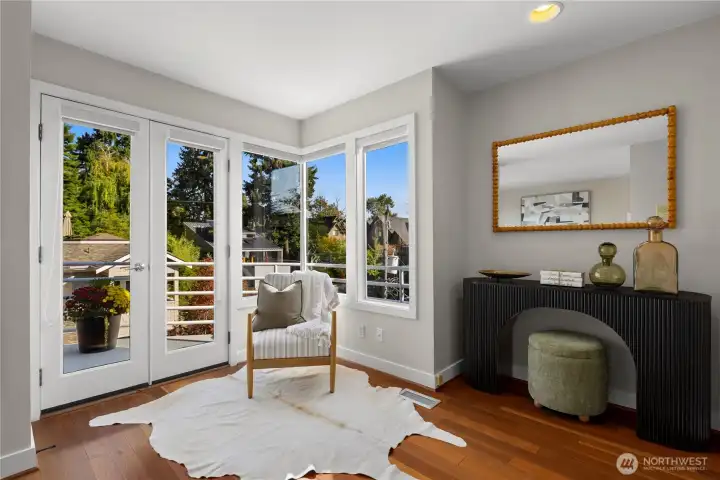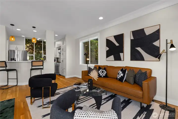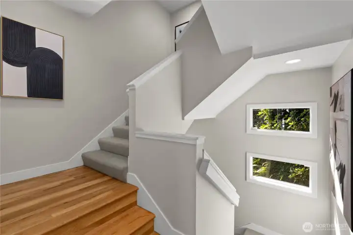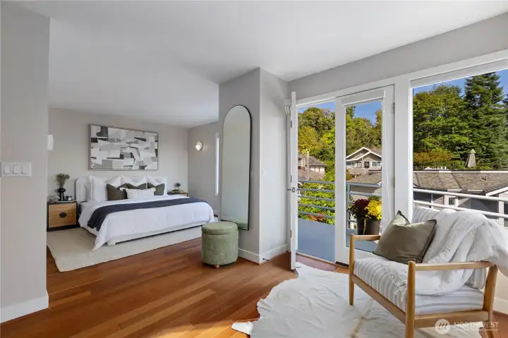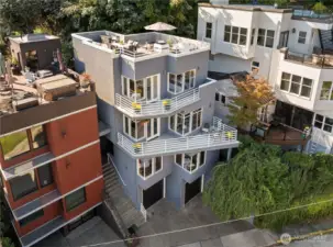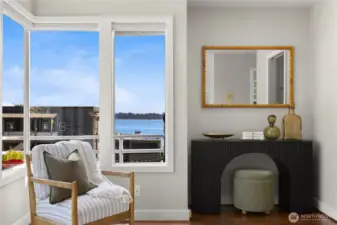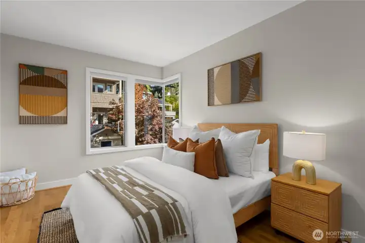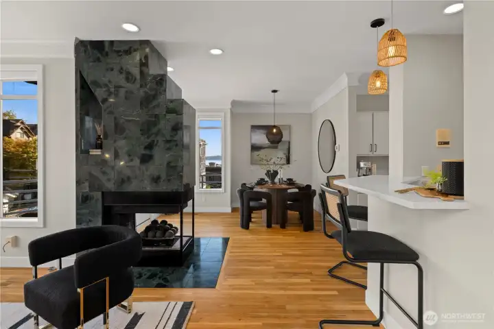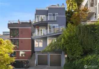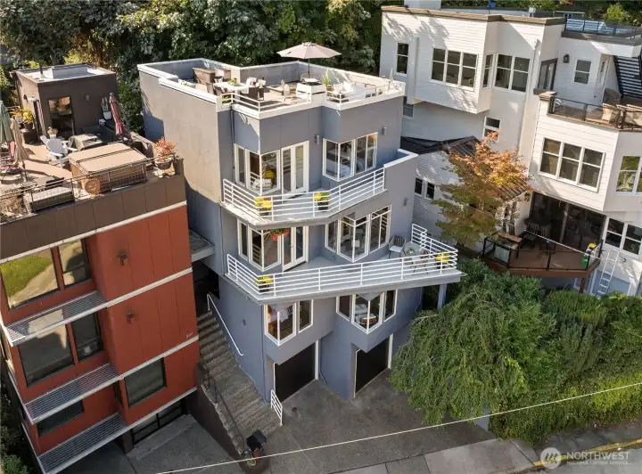 Amazing view home just a half block walk the lake and everything Leschi has to offer! Single-family, detached home perfectly captures the essence of Leschi living, w/ stunning views from nearly every room. Natural light floods into the spacious interior, with each floor opening to a decks with breathtaking vistas, whether you're relaxing in the living room or enjoying morning coffee from the expansive rooftop deck w/ panoramic views of the lake, Cascades and Bellevue. Perfect for large scale entertaining. Open-concept living features an updated kitchen, dining & living area with a statement FP. Primary suite with sitting area, walk-in closet & 5-piece ensuite bath. AC, large laundry room, 2 car garage & storage complete this fantastic home.