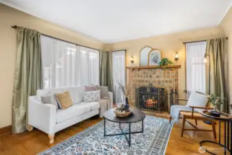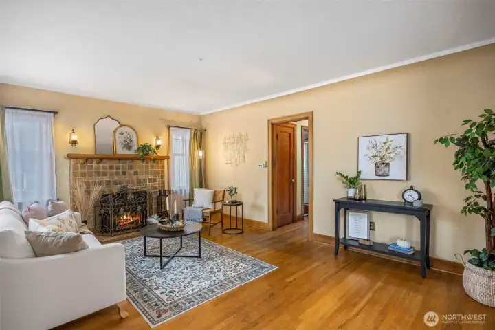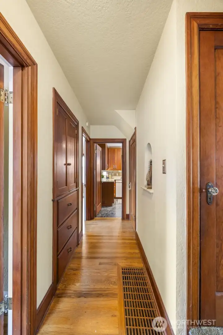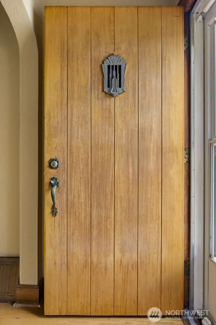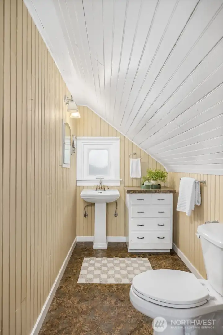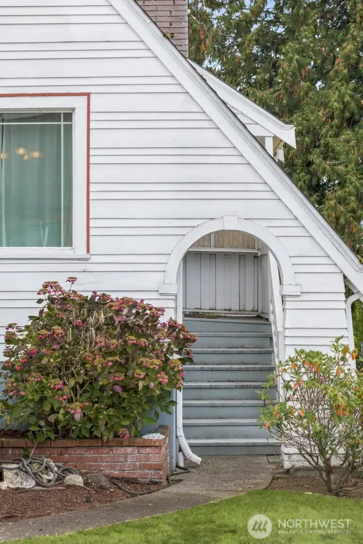 Vintage beauty 4 BR 1.5 bath loaded with timeless character, wonderful flow & modern function. Original hardwood floors. Original doors, door handles & skeleton keys. Elegant gothic archways. Charming coved ceilings. Spacious inviting living room with Batchelder inspired wood burning fireplace. Beautifully updated kitchen. Open sunny dining space. 2 BR and full bath on main floor. Upper level features enchanting knotty pine bonus space, 2 BR's and half bath. Tons of storage space upstairs. Large unfinished basement with 1 car garage. Alley access to garage. Vinyl windows. Gas heat. This home has been well loved for decades and enjoys a quiet tucked in location. Just minutes to PSNS & Seattle ferry.