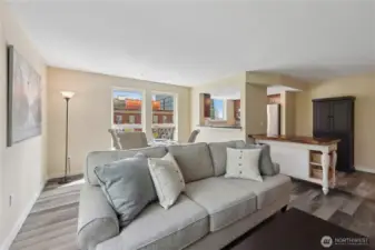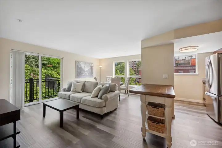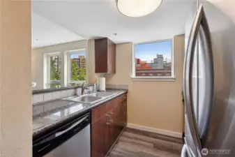 Welcome to Tobira…! Centrally located at the intersection of Downtown, the International District, Pioneer Square, and the Stadium District, the best of Seattle is at your doorstep. Walkscore 98. Transitscore 100. This spacious, light-and-bright corner unit looks out across verdant treetops to city views beyond. Tons of space for the money, with TWO of everything: two bedrooms, two full baths, and two parking spaces. A virtually impossible find for under $500K. This stylish flat has been updated with clean, hypoallergenic LVP flooring throughout. Granite countertops and stainless steel appliances too. Inviting great room design with space for a full-size sofa and full-size dining set. Secure lobby entrance. Gated garage. No rental cap...!