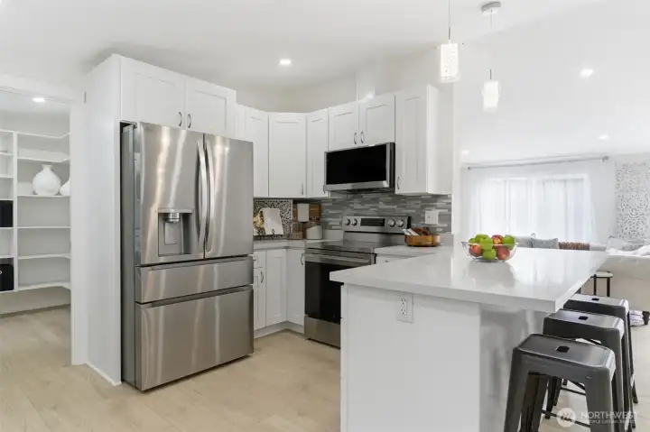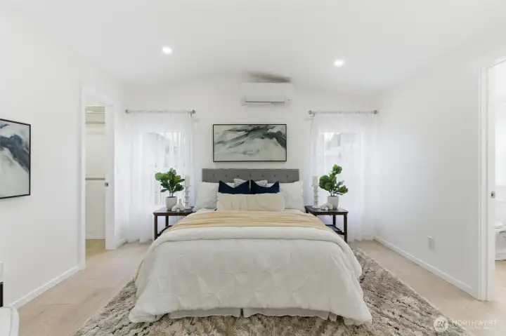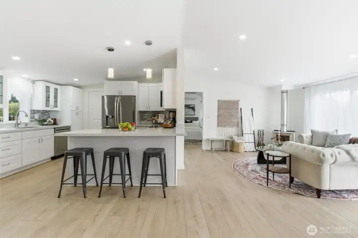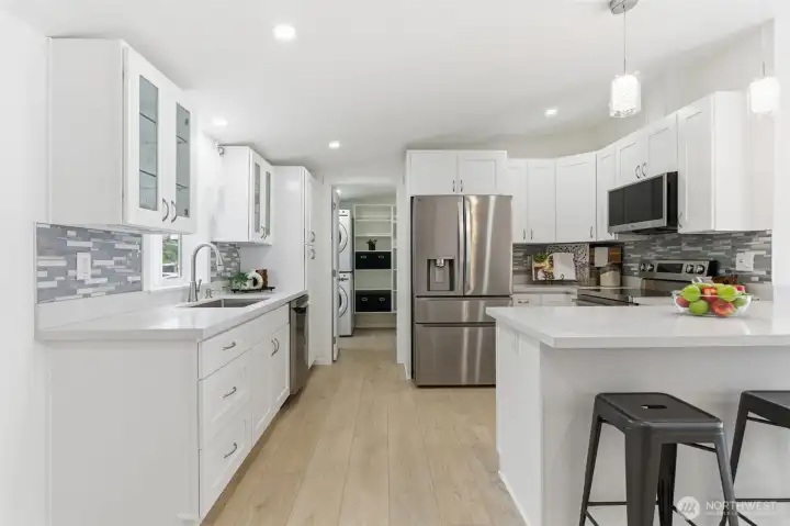 Remodeled to the studs & reimagined with modern style, this 3-bed, 2-bath home lives large. The bright, open floor plan invites you in, while cozy living areas & a well-appointed kitchen with high-end SS appliances offer space for entertaining & relaxation. A wood stove & 4-zone mini-split A/C provide year-round comfort. Just off the kitchen, find a convenient laundry area with California Closets® shelving. The spacious primary suite includes a full ensuite with built-in shelving, while two bedrooms & a second full bath complete the home. Outside, enjoy a large patio, new sod, Hardie® Plank siding, roof & vinyl windows. Automatic gated 4-car asphalt driveway adds privacy. Near Paine Field, Boeing, Mukilteo schools & shops. Welcome home!