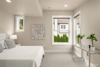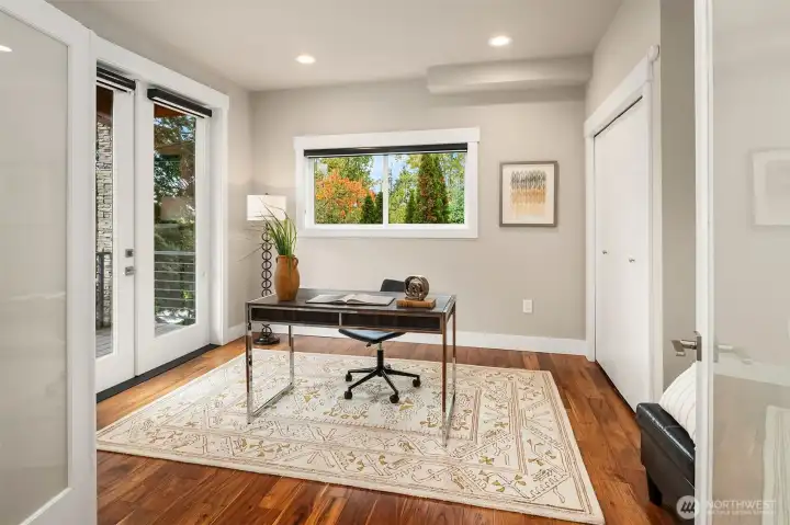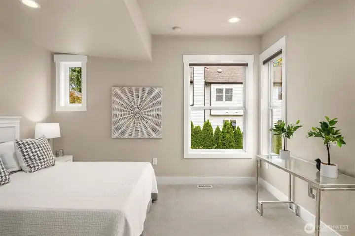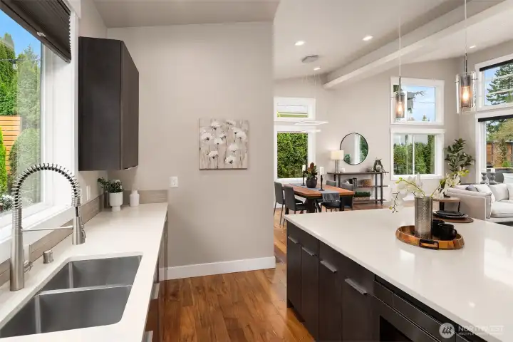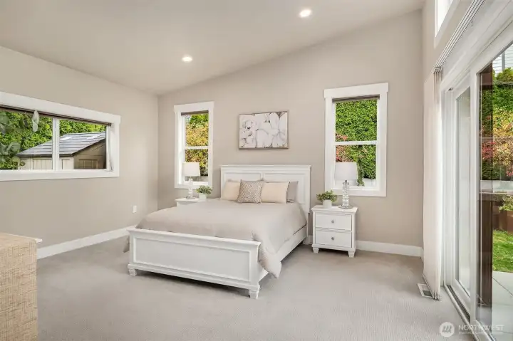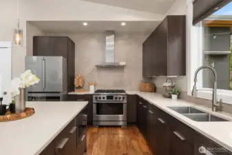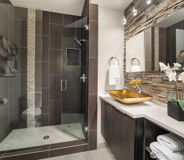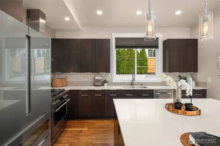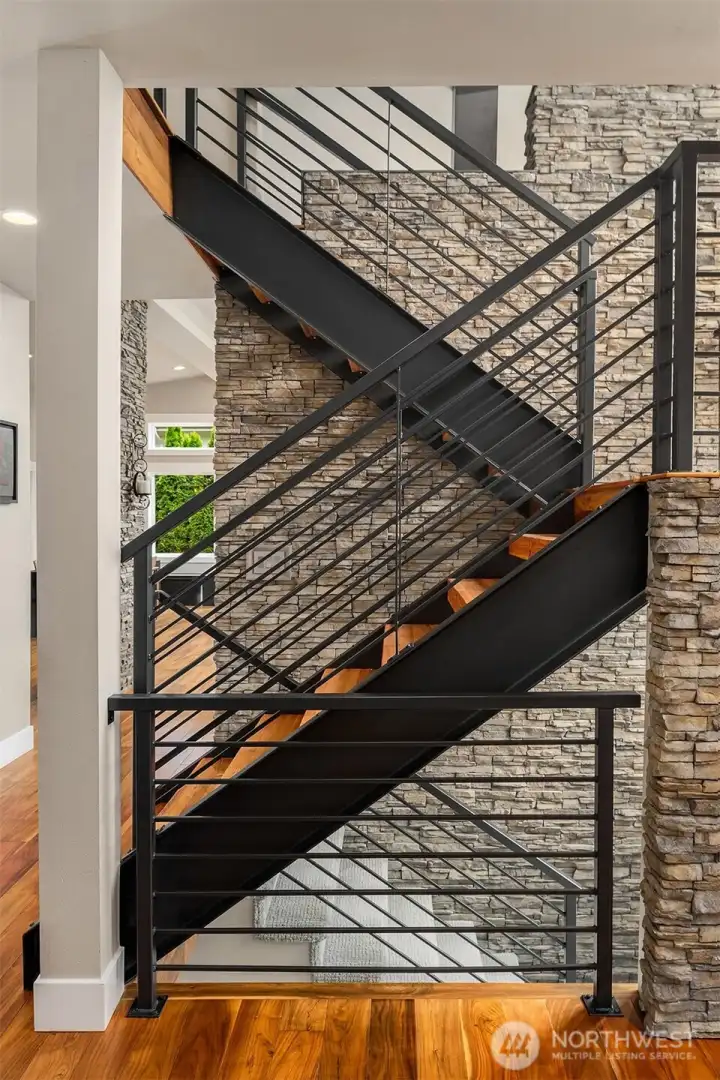 Get ready for a modern masterpiece just around the corner from downtown Kirkland. This stunning home blends stone pillars, acacia hardwood, and slate fireplace with sleek lines. A bold floating staircase and soaring ceilings frame huge west-facing windows, flooding the flexible, open-concept great room with light. The main floor features a chef’s kitchen, home office or 5th bed, and guest ensuite with patio access. Upstairs, the primary suite wows with a private balcony, stone fireplace, and spa-like ensuite. The lower level offers a bonus/media room and 650-bottle wine cellar. The epic backyard has a gas fire pit, dining area, and space to play and lounge. All on a quiet dead-end street close to restaurants/shopping, Marina Park and LWSD.