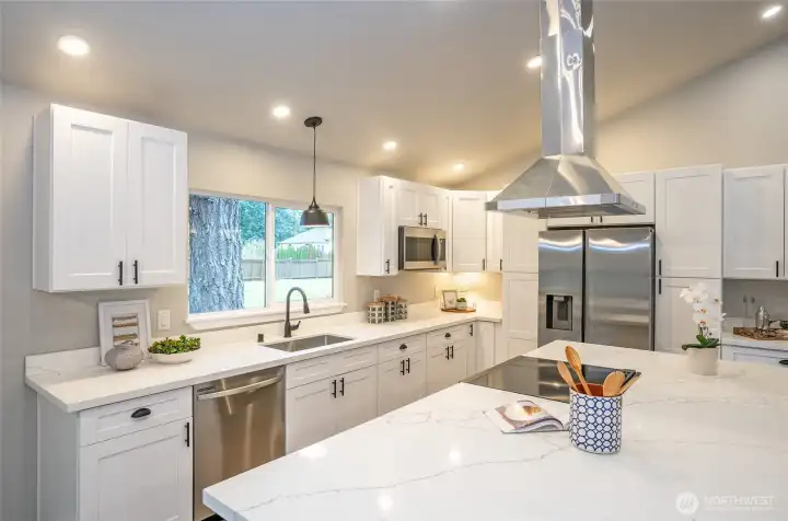 Fully Updated 1,848 sq ft, 3 bed + den/office, 2 bath home on 1.25 private acres. The open kitchen features all new cabinets, Quartz counters & back-splash, new Appliance package including fridge & glass top range. Vaulted ceilings and engineered plank floors throughout the living area. All new doors, millwork, paint, lighting & plumbing fixtures. Primary bedroom includes a large walk in closet & a bathroom with double sinks, freestanding bathtub & walk in shower. New Vinyl windows. Separate laundry room. Brand new 720 sq ft detached garage. Plenty of Boat or RV parking. No HOA dues. Come see!