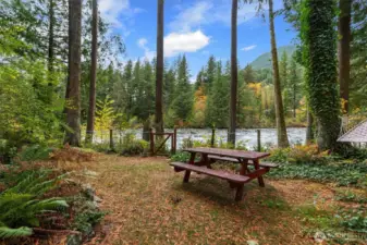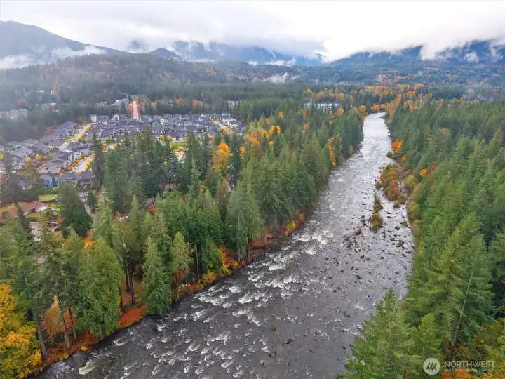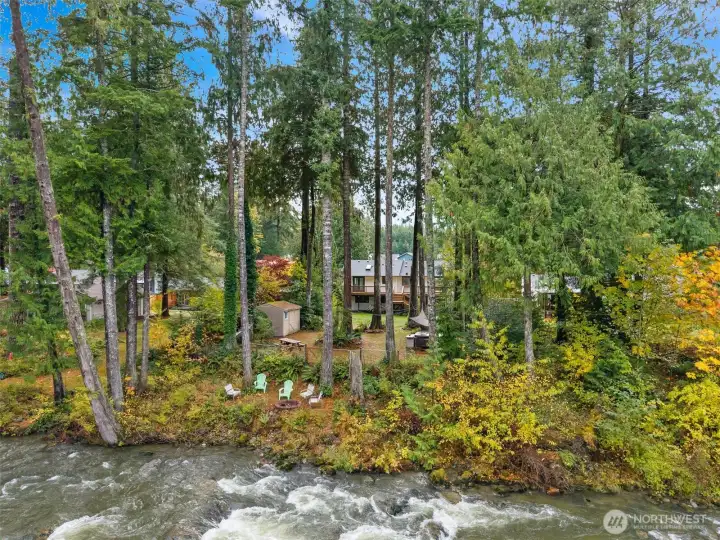 Experience true PNW living on the Snoqualmie River. This rare retreat offers 85 feet of private shoreline with beautiful Mt. Si views. Wake to the sound of rushing water, and wind down by soaking in the hot tub under the stars. Thoughtfully designed, this 3 BD/2.25BA home feels bright and inviting with river and mountain views from nearly every room. The open kitchen with stainless appliances flows into a living area anchored by a cozy wood-burning fireplace. A lower-level rec room adds space to relax with a pellet stove and outdoor access. Outside, enjoy a fully fenced yard, two sheds, a riverside fire pit, and plenty of space to entertain. Just minutes to downtown North Bend, trails, and parks - this is riverfront living at its finest.